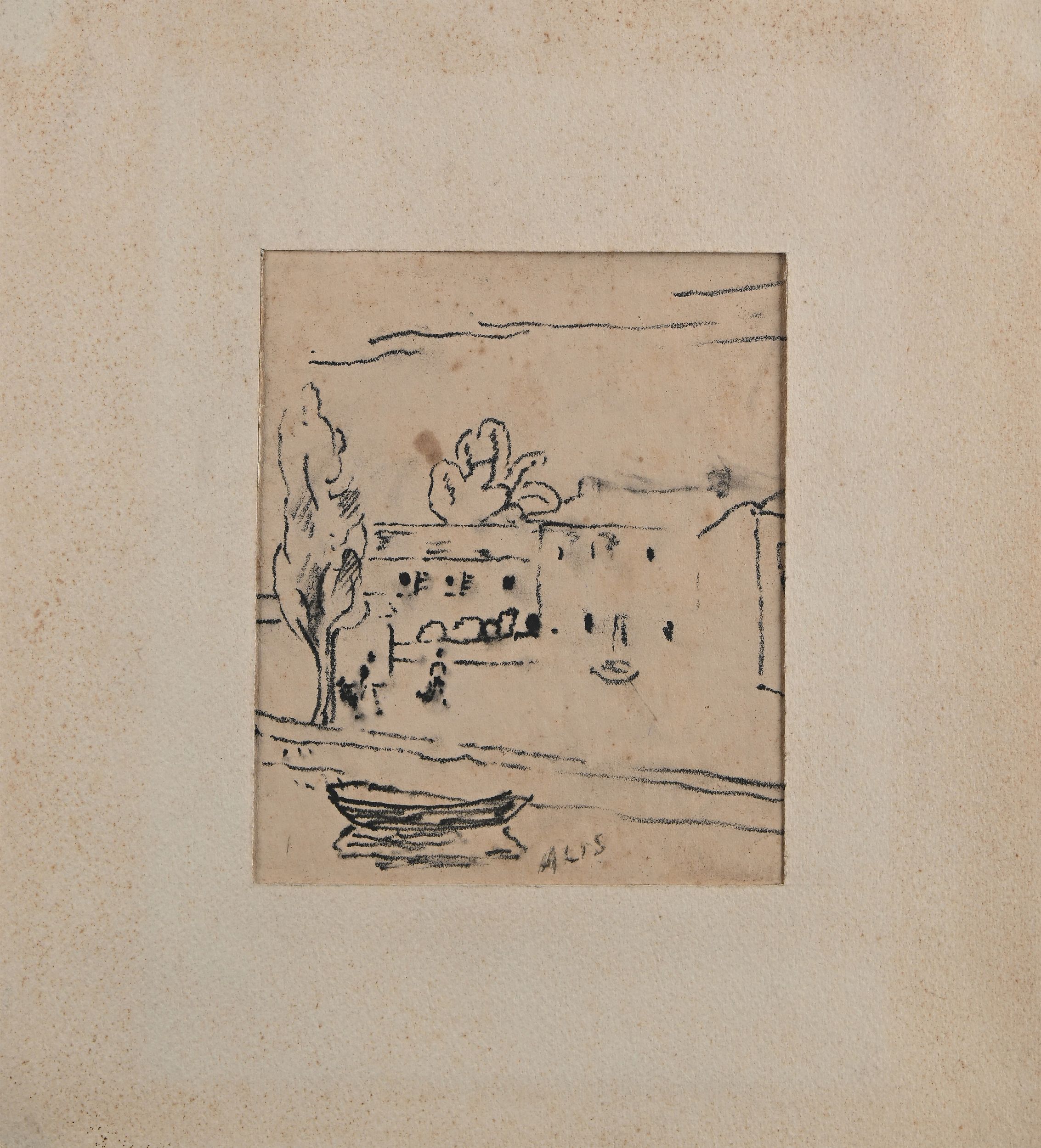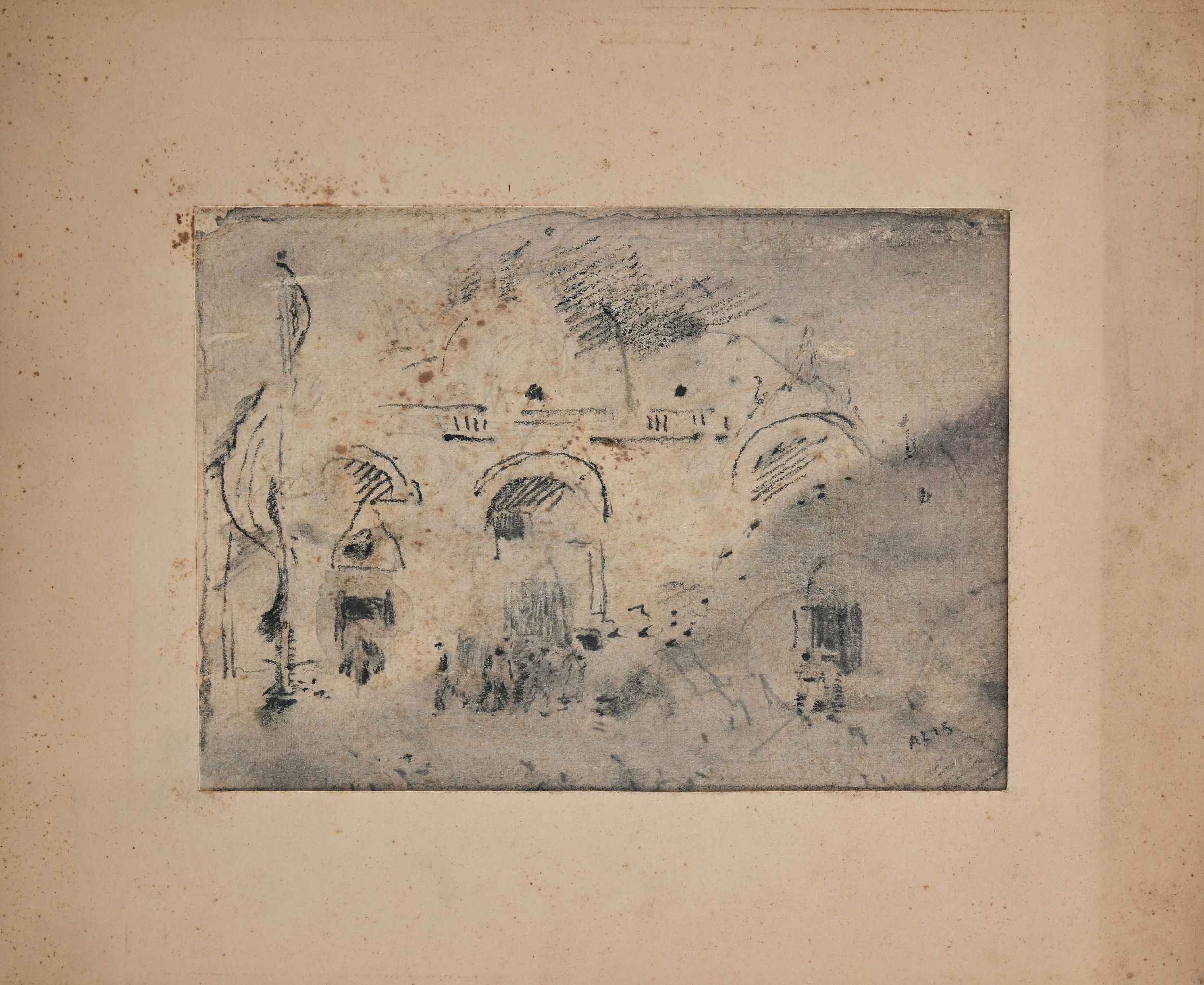 1) Piazza San Marco a Venezia, matita e acquarello su carta, cm 14x19,5, firma in basso a destra Alis.2) Paesaggio con casolari e barca, matita su carta, cm 16x12, firma Alis.