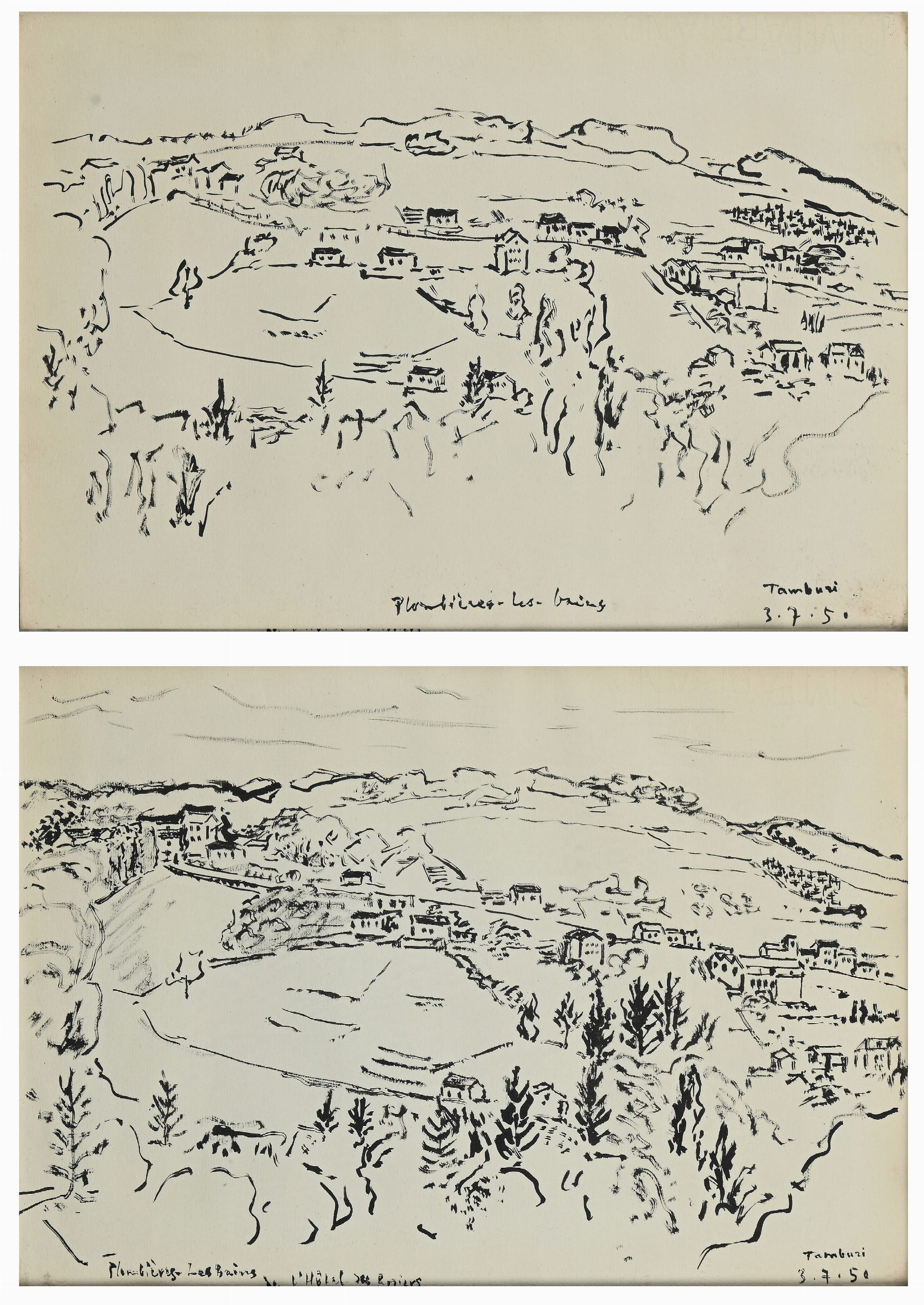 1- Plombieres-les-Bains, L'Hotel des Rosiers, 1950, Tempera su carta, cm 23x32 - con cornice cm 25,5x34,5. Titolo, firma e data Tamburi 3.7.50.