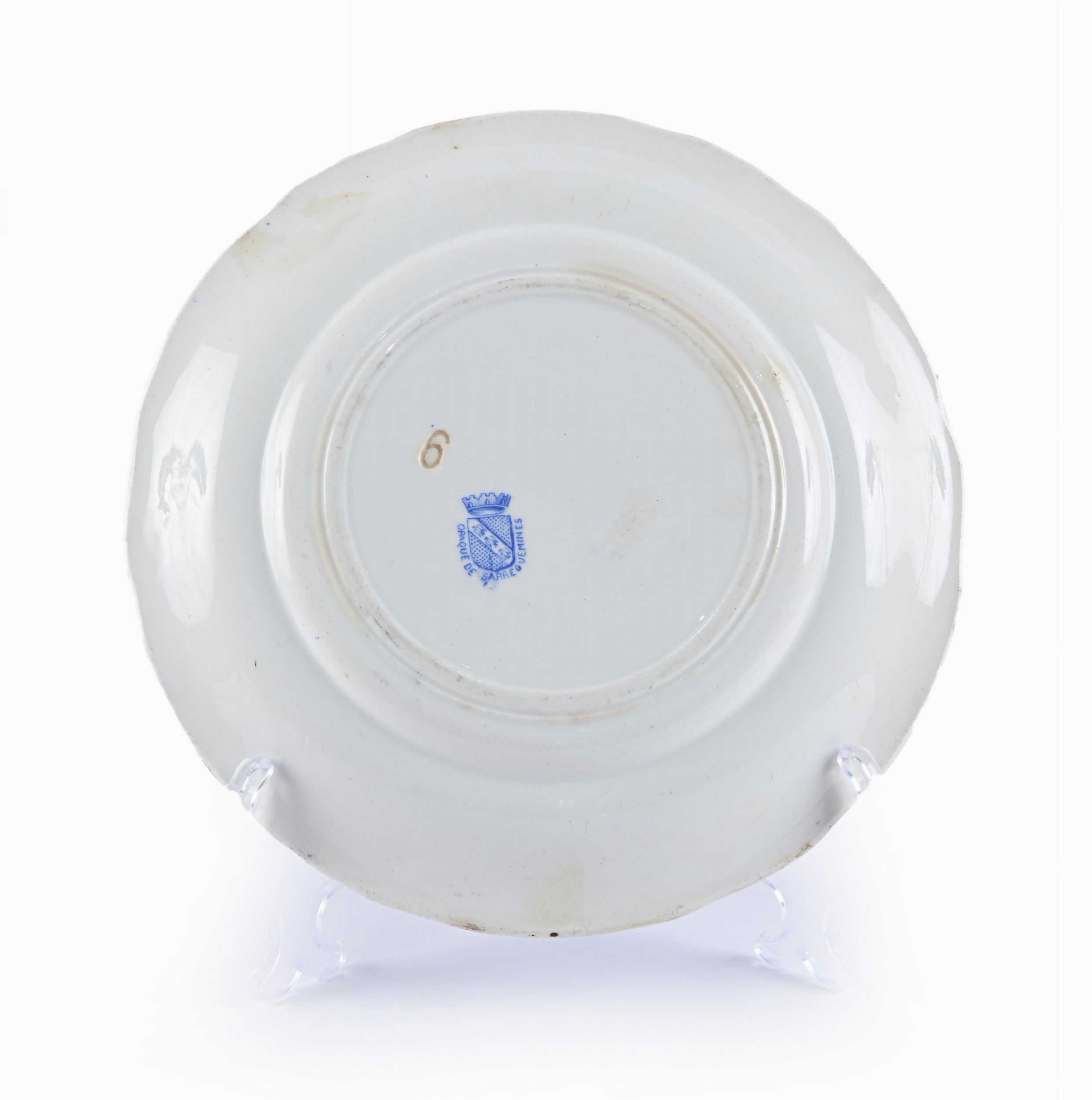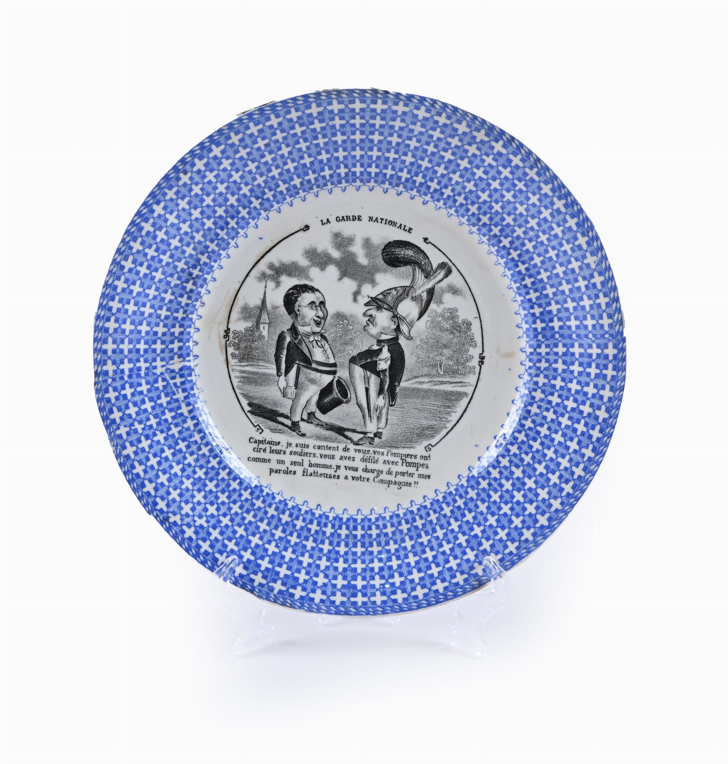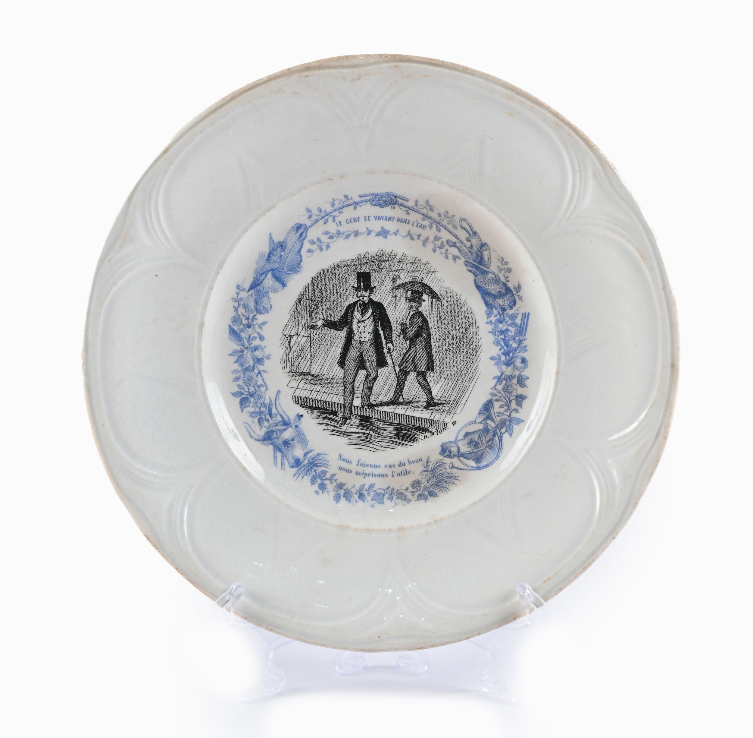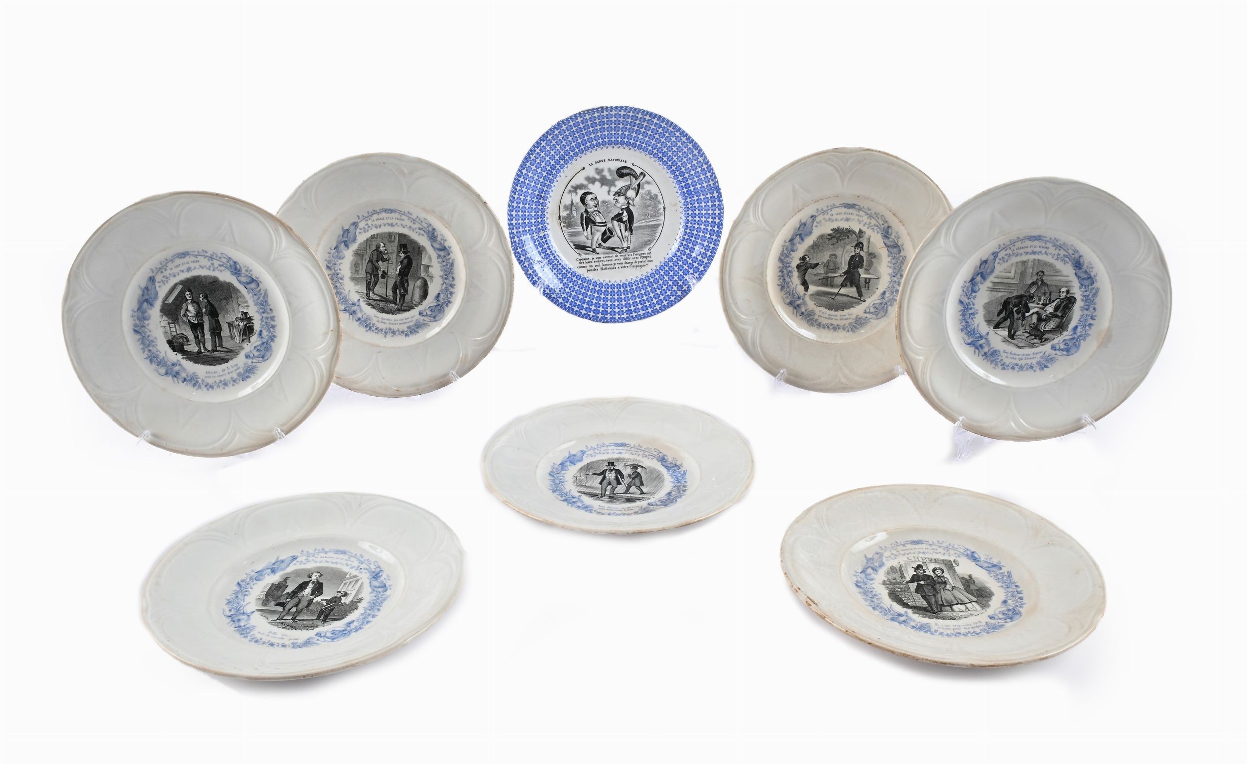 sette della manifattura di Choisy le Roy sotto la direzione di Hippolyte Boulanger, ispirati alle fiabe di La Fontaine (marcati ognuno H.B. Porcelaine de Choisy le Roy); l'ottavo, manifattura di Sarreguemines, raffigurante un dialogo satirico intitolato La Garde Nationale, (marcato Opaque de Sarreguemines).