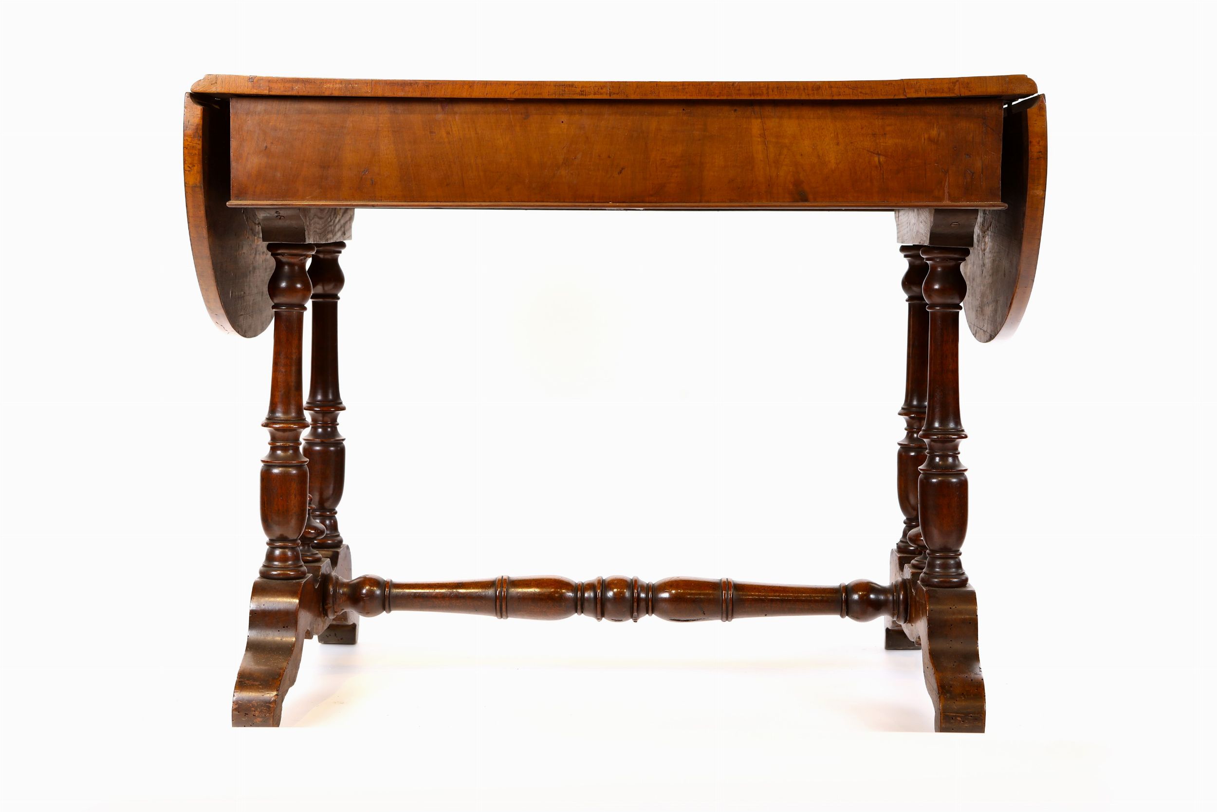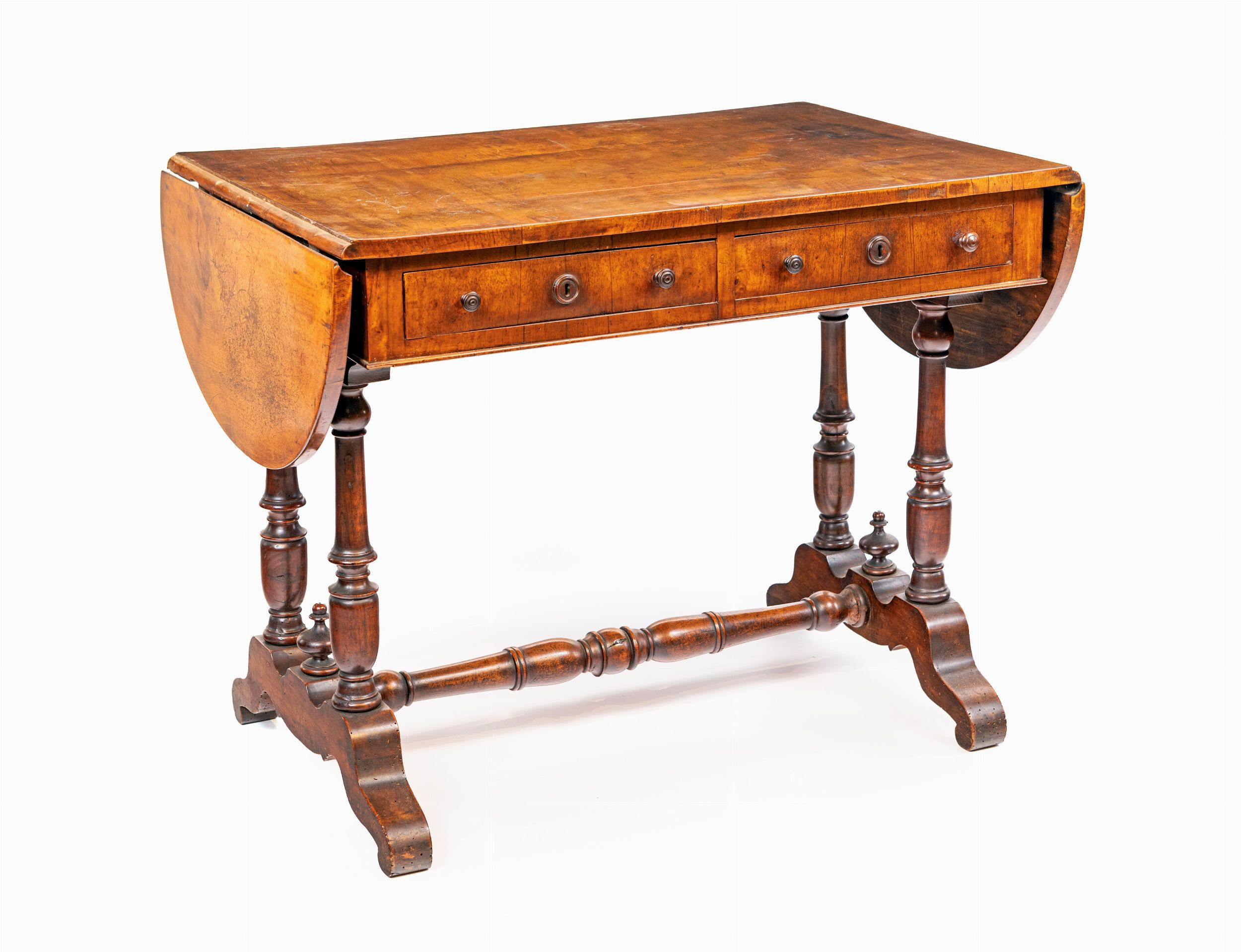 due cassetti in linea nella fascia con bocchette e pomelli in legno, gambe tornite unite da traverse