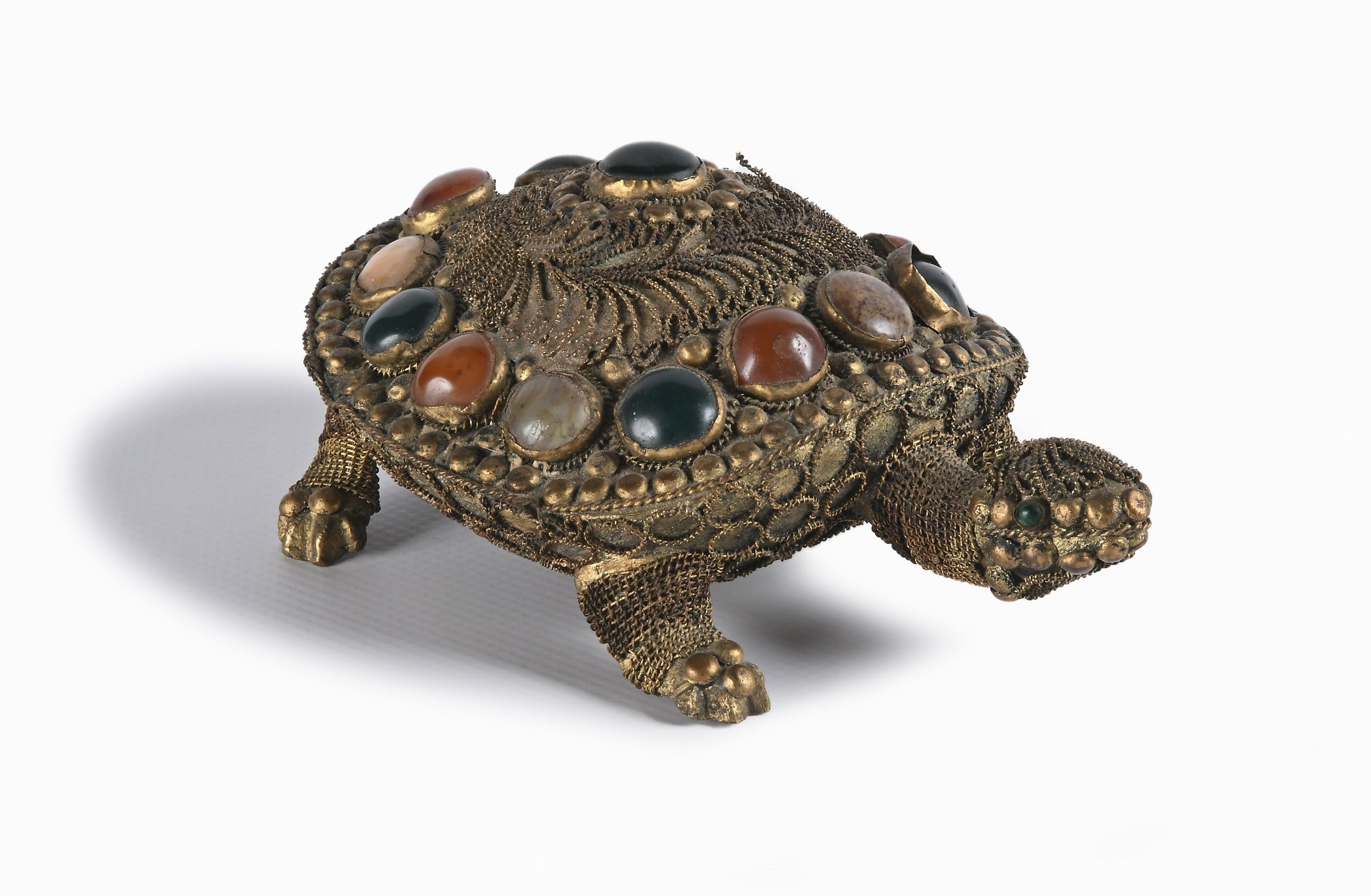 carapace impreziosito da minuziosa lavorazione applicata in filigrana e da quattordici gemme cabochon in pietra dura