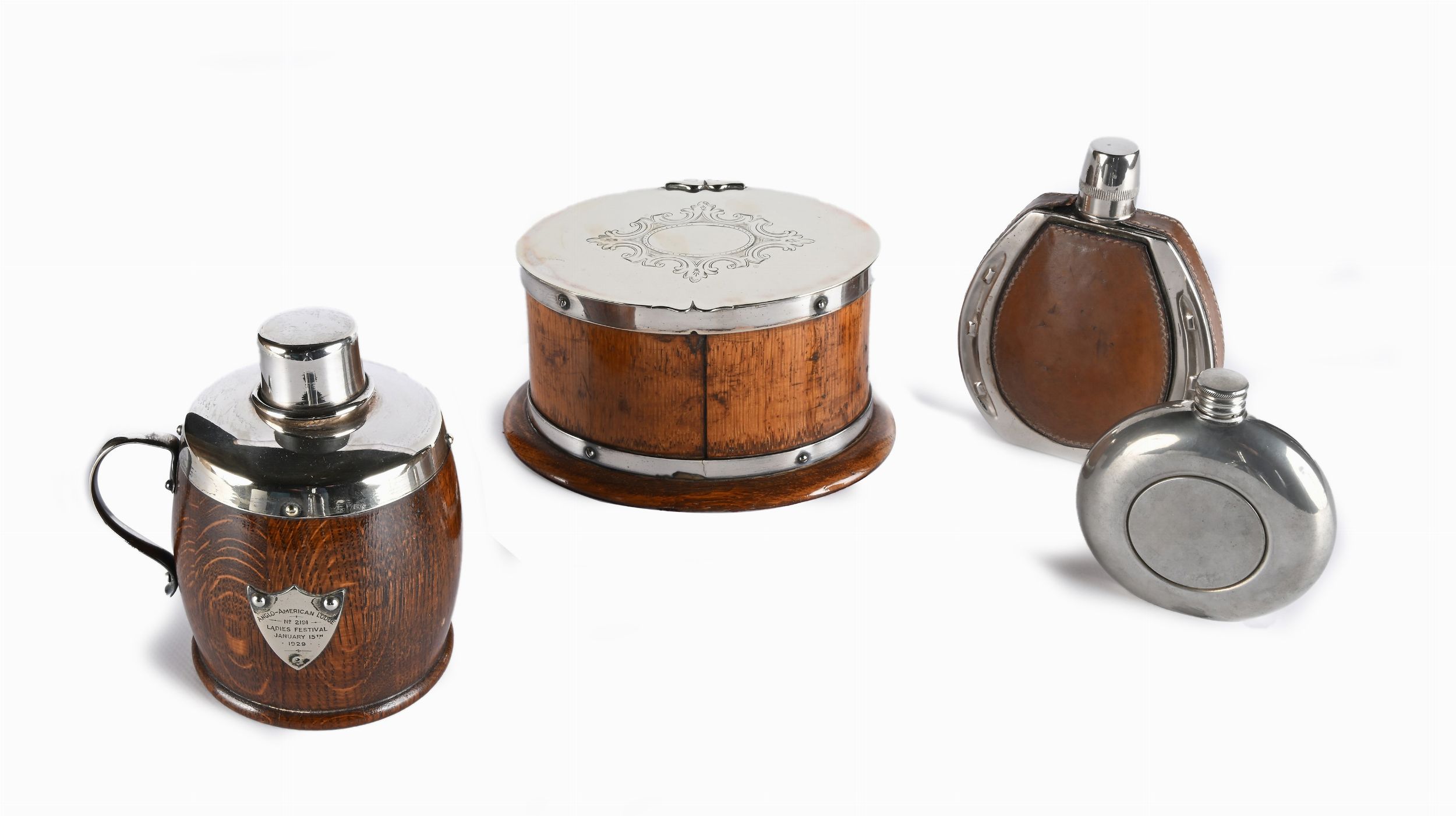 fiaschetta Gucci in cuoio, cm 15x11,5; fiaschetta circolare in peltro sheffield da 5 once, cm 10x9,5; botte Anglo American Lodge 1929, altezza cm 15 e scatola porta tè di forma ovale, cm 10x18x14