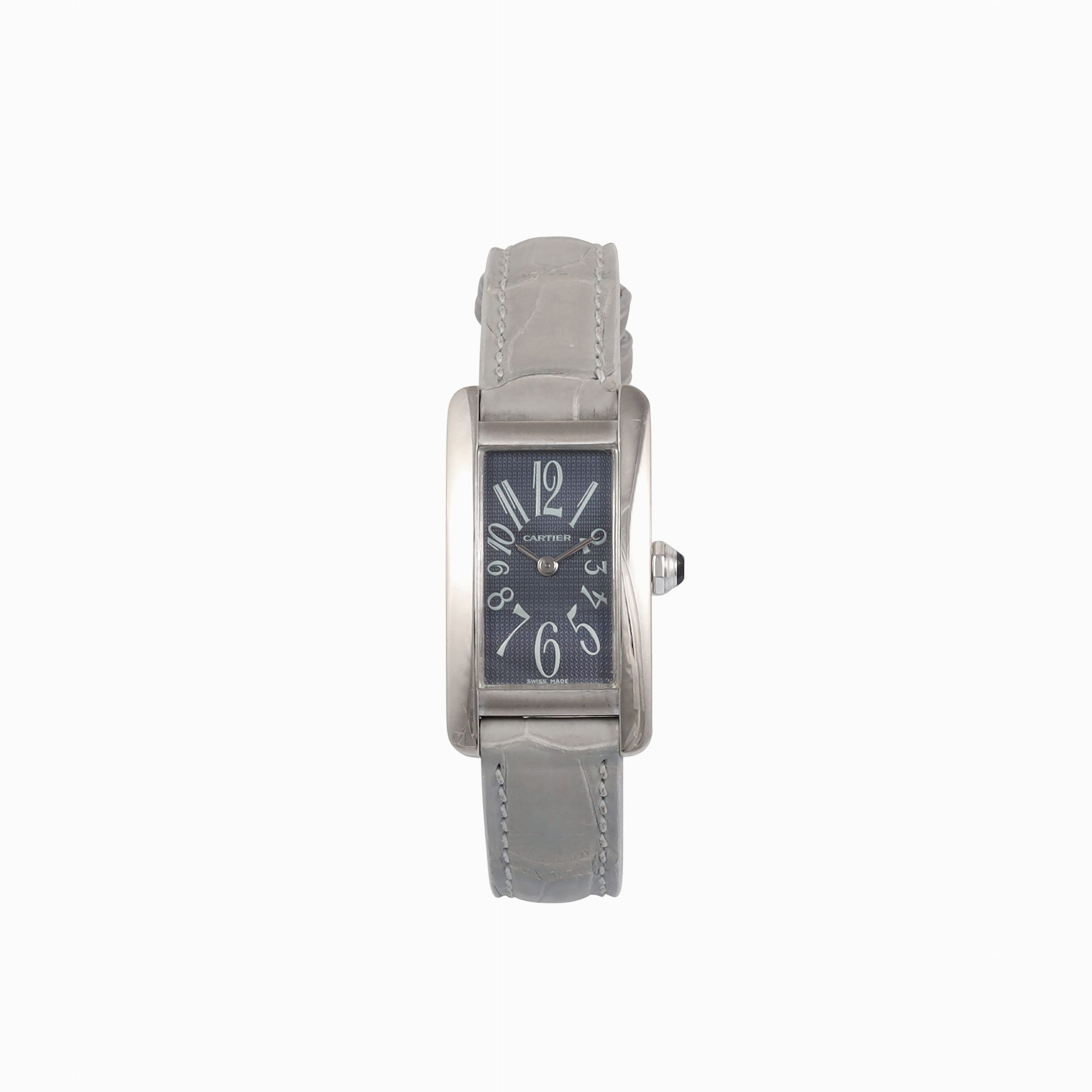 Ref: 1713, Tank AmericaineCassa: in oro bianco 18K, fondello serrato da viti. Vetro zaffiroQuadrante : blu e numeri Arabi. Sfere a bastoneMovimento: al quarzoCinturino: originale con fibbia in oroAnno: 2000 circaDIM: 19 x 34 mm
