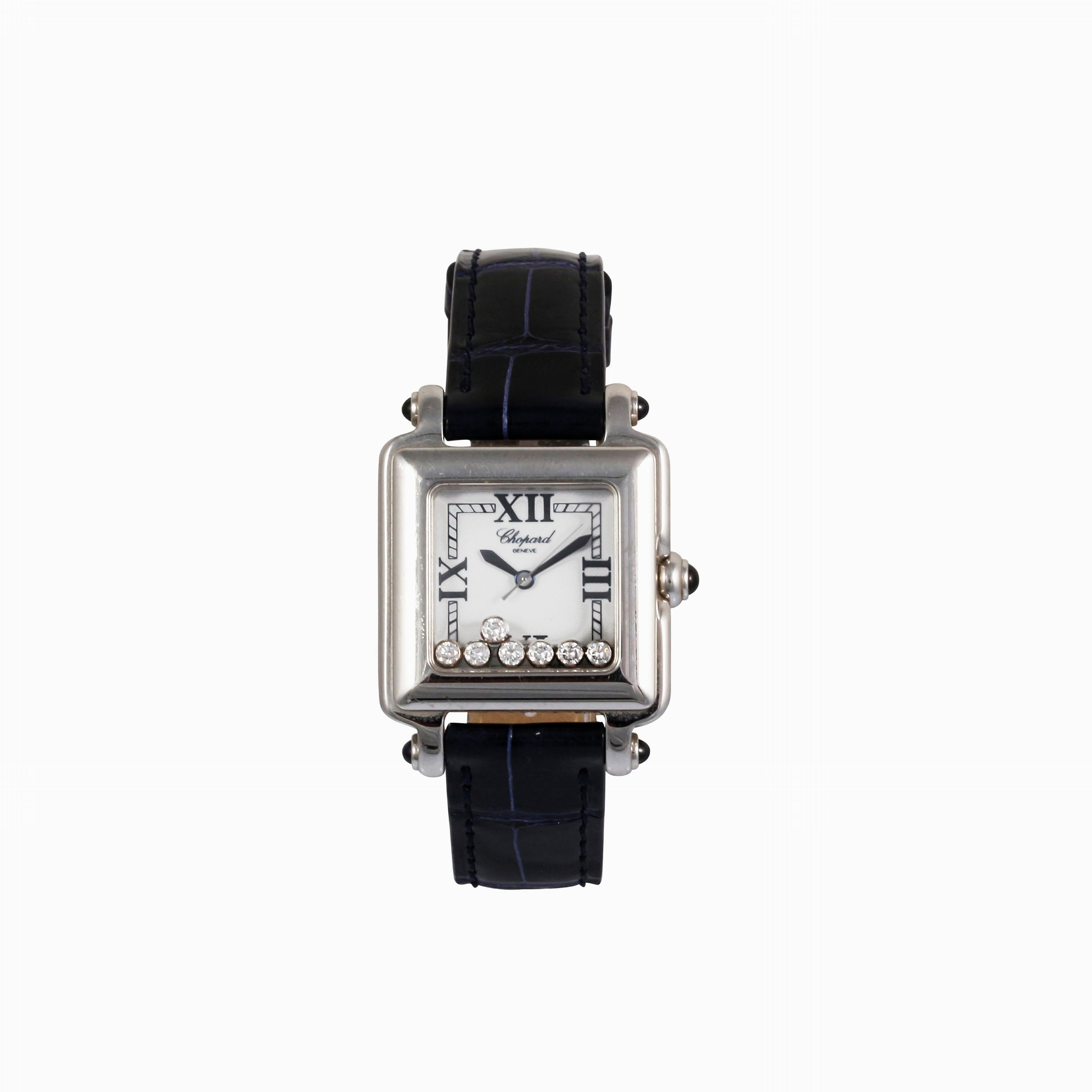 Ref: Happy SportCassa: in acciaio, fondello serrato da viti. Vetro zaffiroQuadrante: Bianco, numeri Romani, con 7 brillanti, datario. Sfere EpeeMovimento: al quarzoCinturino: originale con fibbia originaleAnno: 2000 circaDIM: 27 x 36 mm