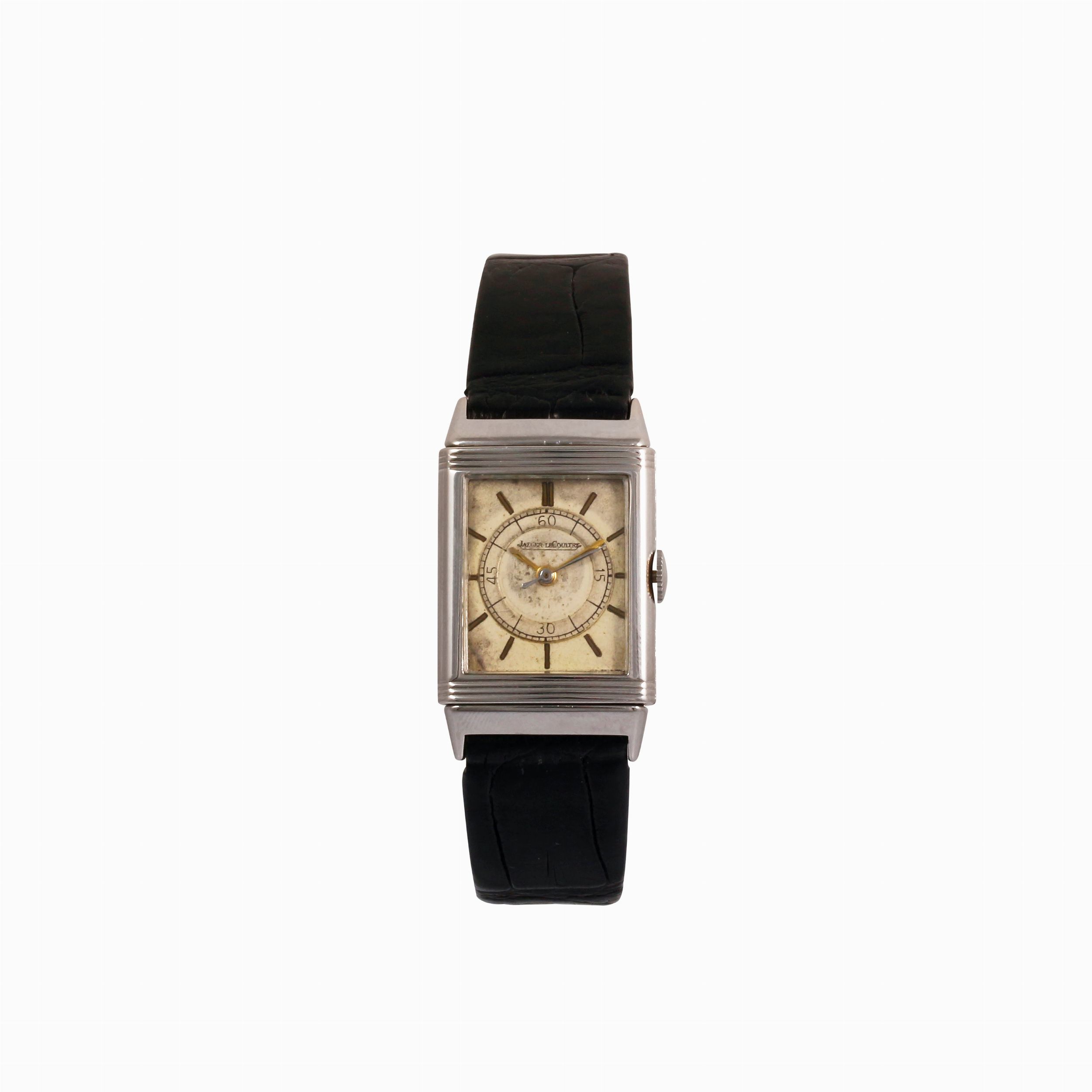 Ref: Reverso, 11518Cassa: in acciaio, reversibileQuadrante: Argento patinato, indici a bastone. Sfere a bastoneMovimento: manualeCinturino: fibbia originaleAnno: 1930 circaDIM: 38 x 23 mm