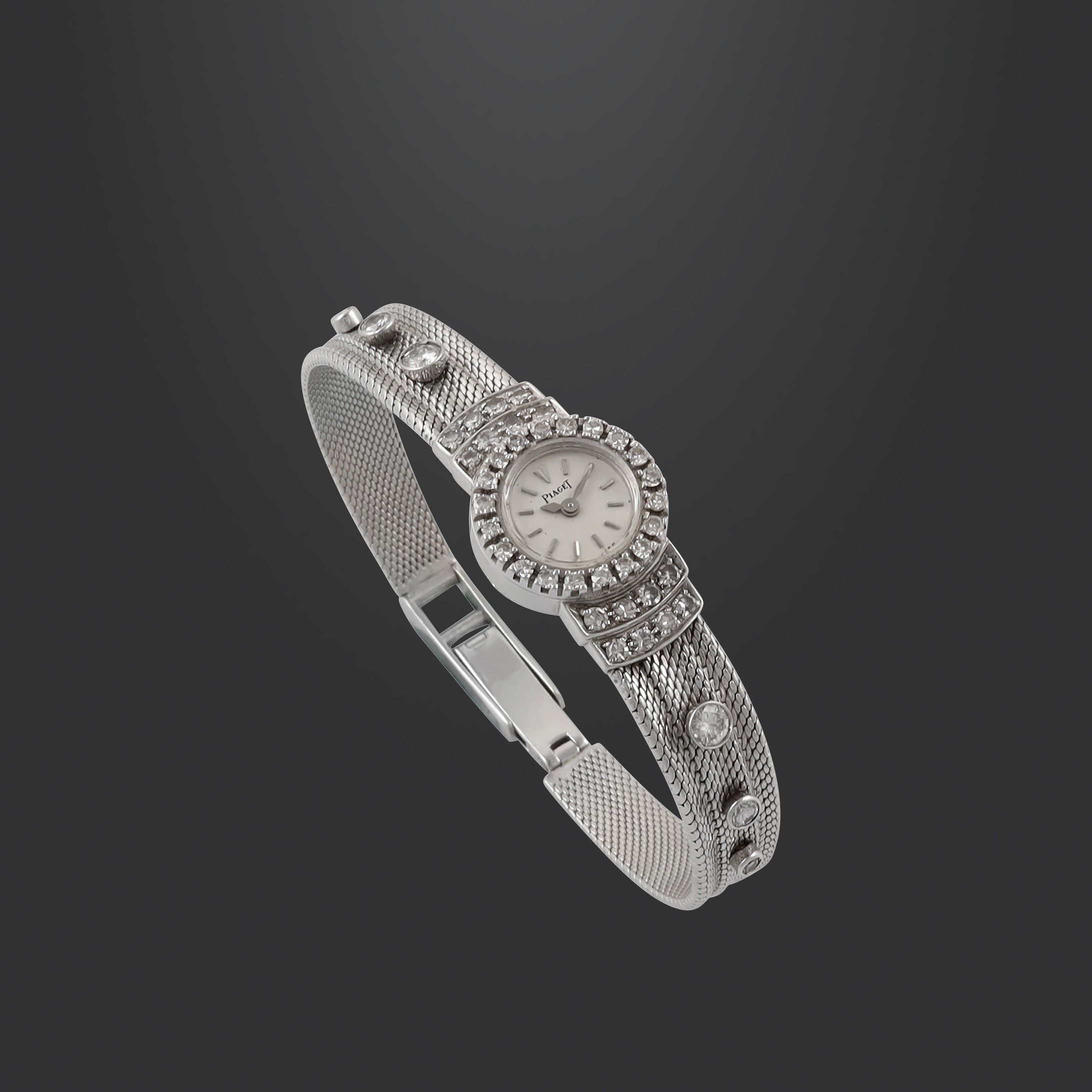 Cassa: in oro bianco 18K e brillanti, fondello a pressioneQuadrante: argento, indici a bastone. Sfere AlphaMovimento: manualeBracciale: in oro non originaleDIAM: 16 mm