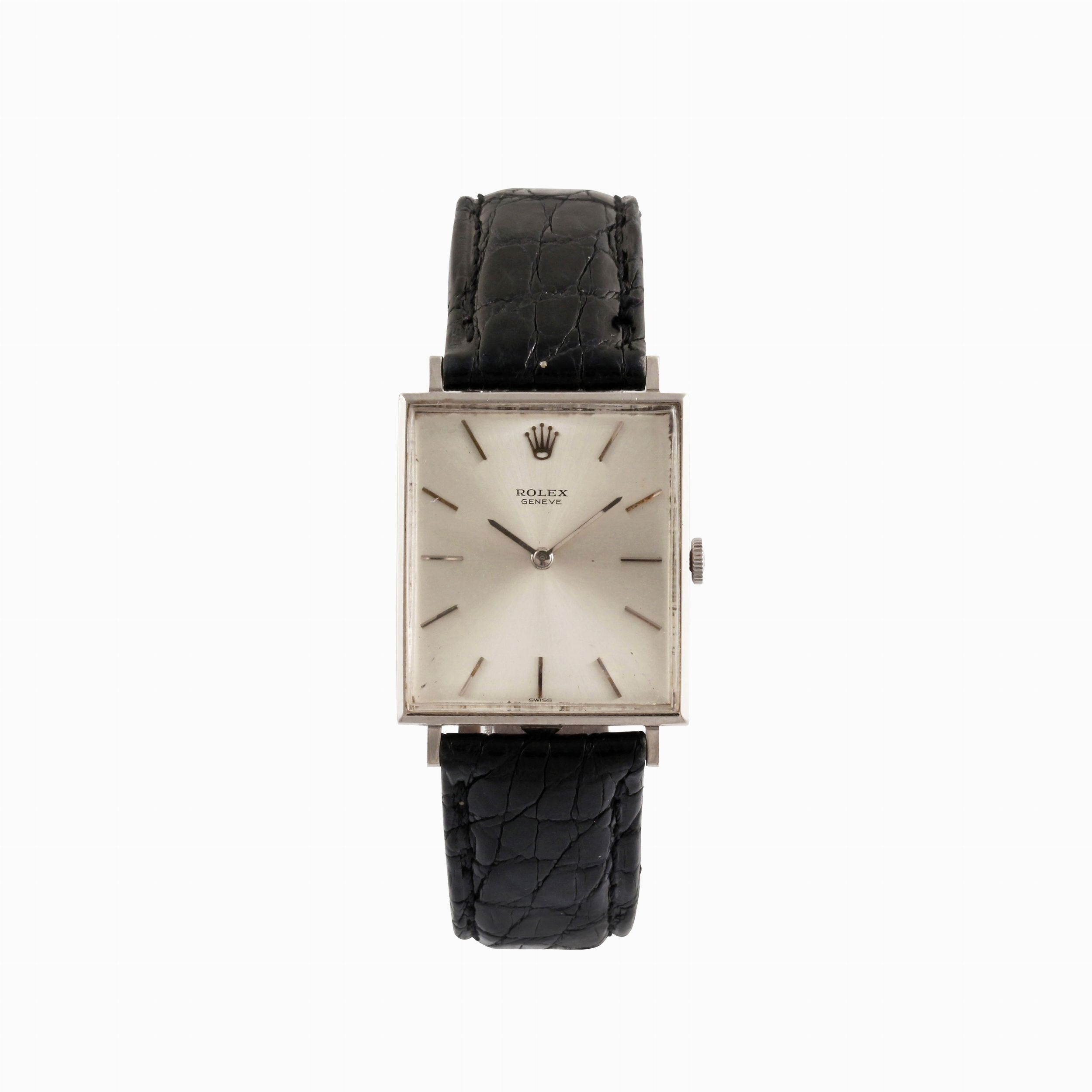 Ref: 3607Cassa: in oro bianco 18K, fondello a pressioneQuadrante: argento, indici a bastone. Sfere a bastoneMovimento: manuale , firmato, cal.1600Cinturino: fibbia originale in acciaioAnno: 1960 circaDIM: 26 x 37 mm
