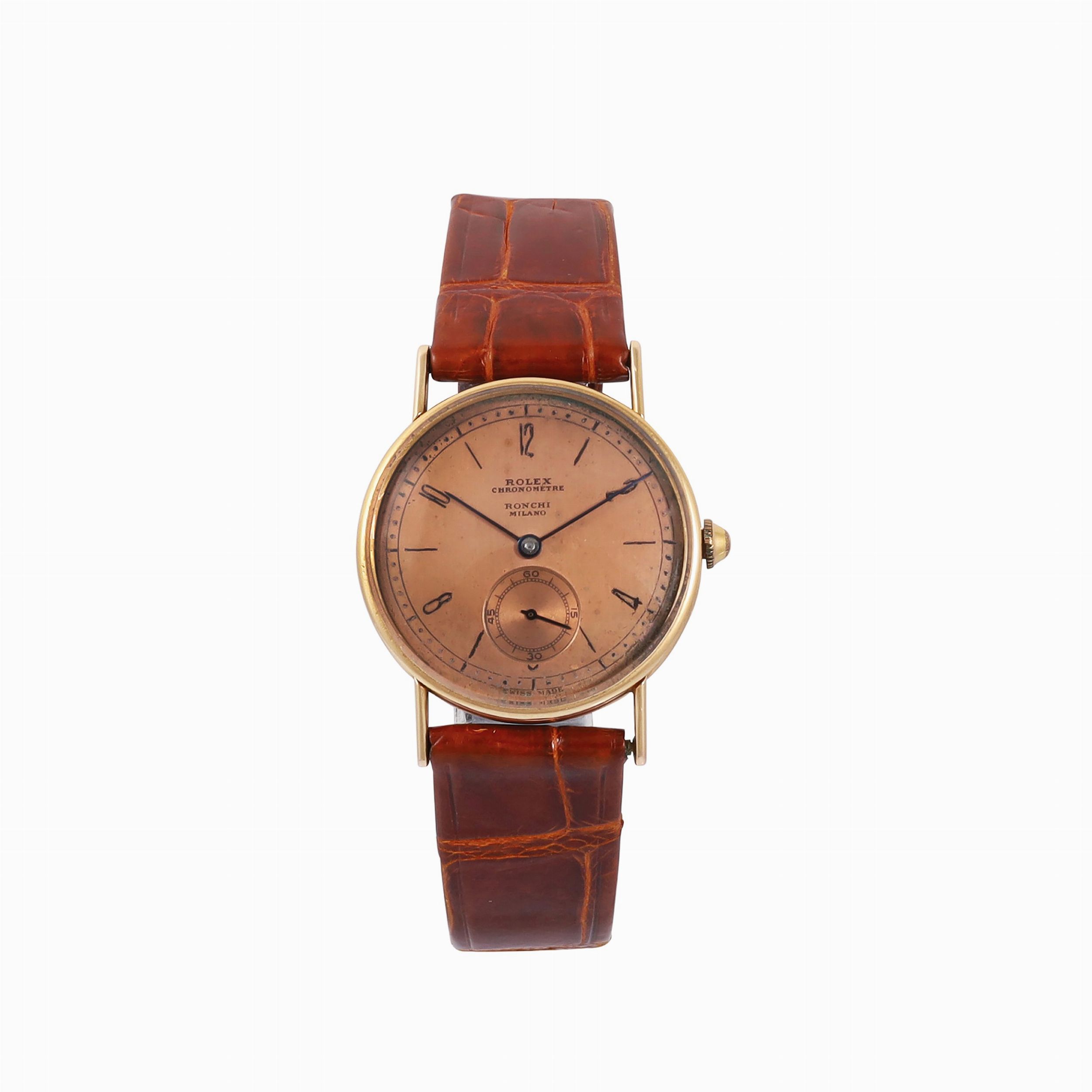 Ref: 3578, Ronchi MilanoCassa: in oro rosa 18K, a gradini, fondello a pressione Quadrante: Rosa con numeri Arabi e indici a bastone. Sfere a bastoneMovimento: manuale, firmatoAnno: 1940 circaDIAM: 32 mmAccessori: scatola originale