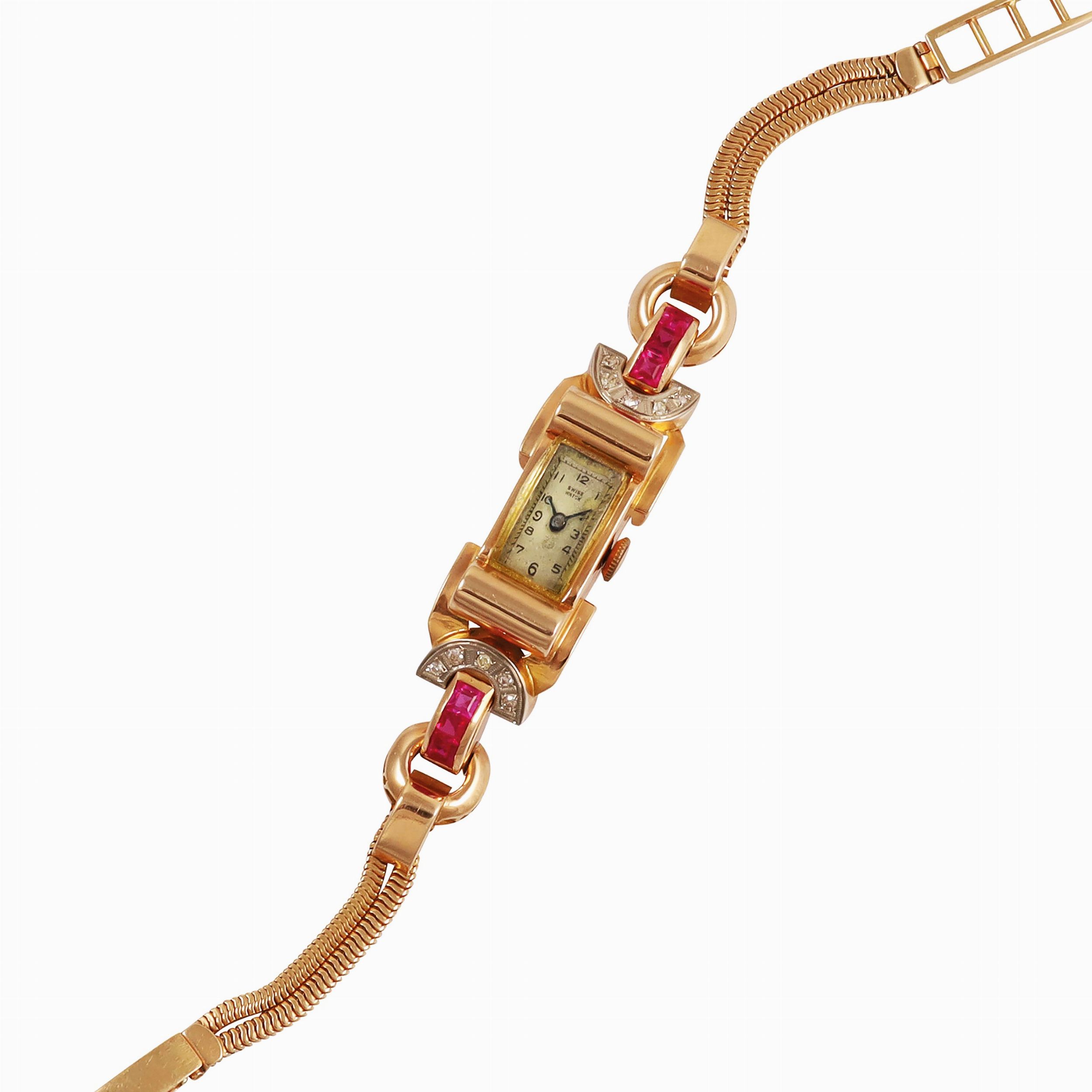 Orologio in oro giallo 18K e rubini sintetici con bracciale in oroRealizzato nel 1940 circaDIM: 11 x 40 mmGr: 31.1