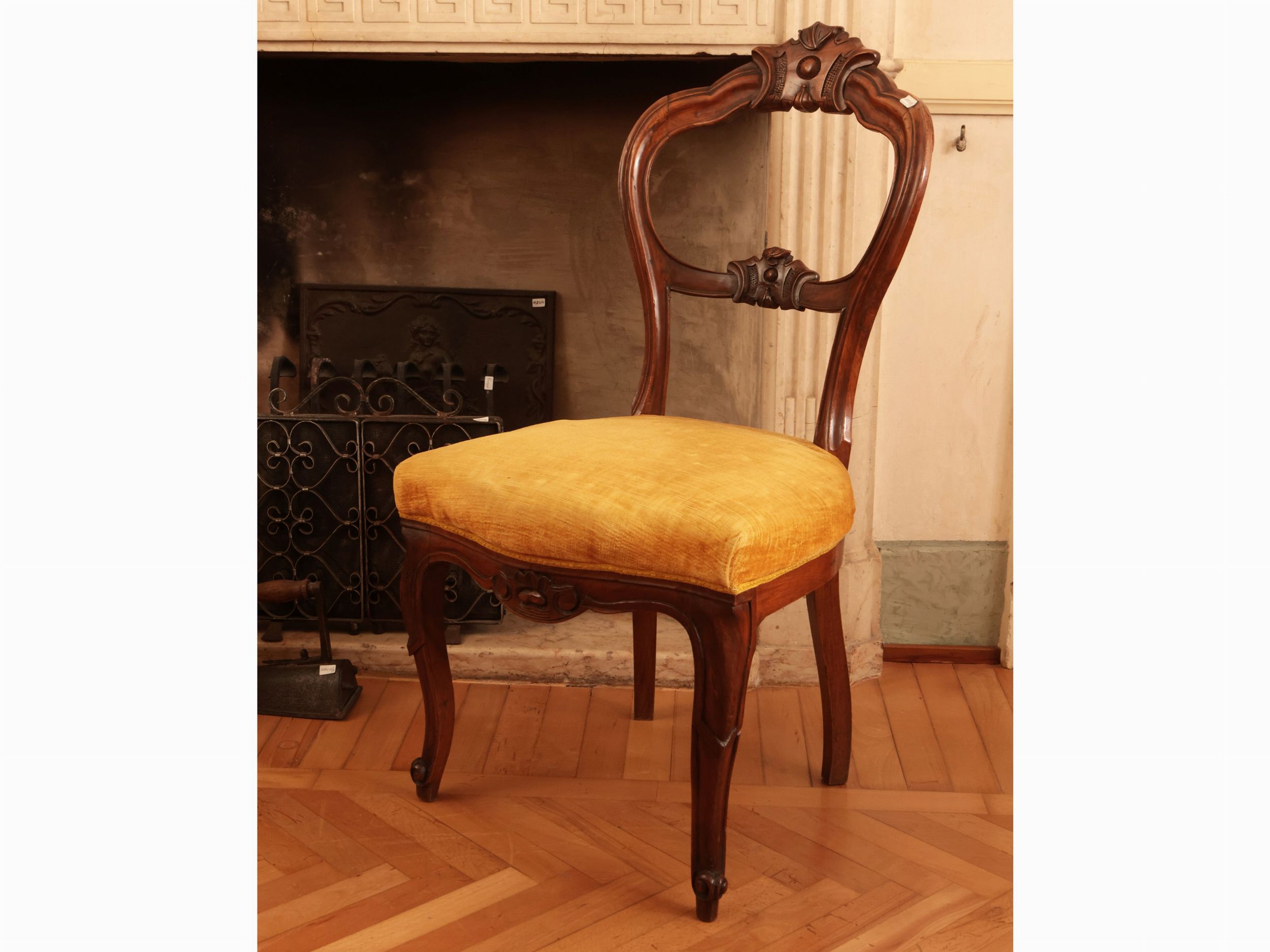 metà del XIX secolo cartella intagliata con cartiglio, gambe anteriori mosse, sedile imbottito e rivestito in velluto giallo oro