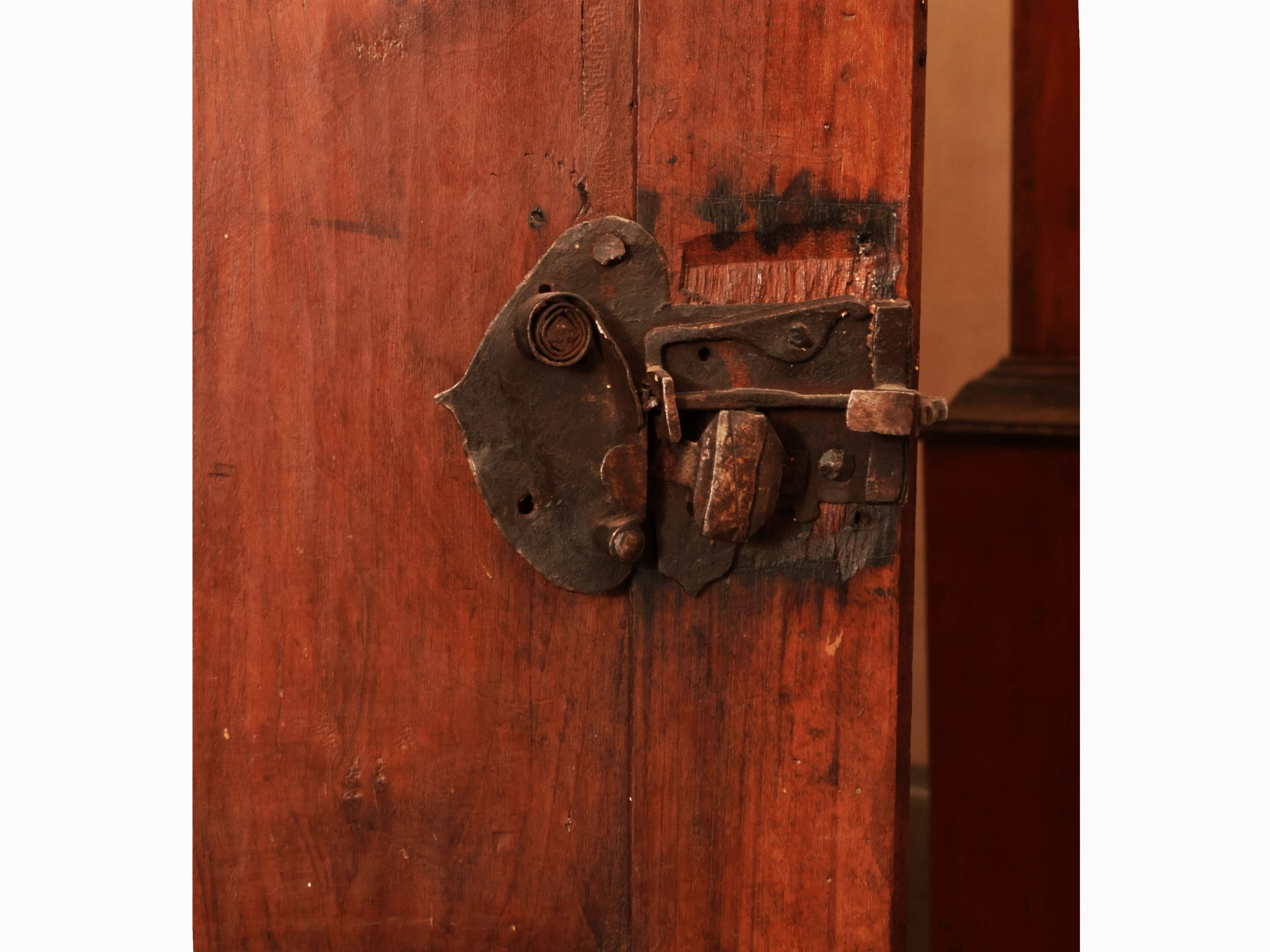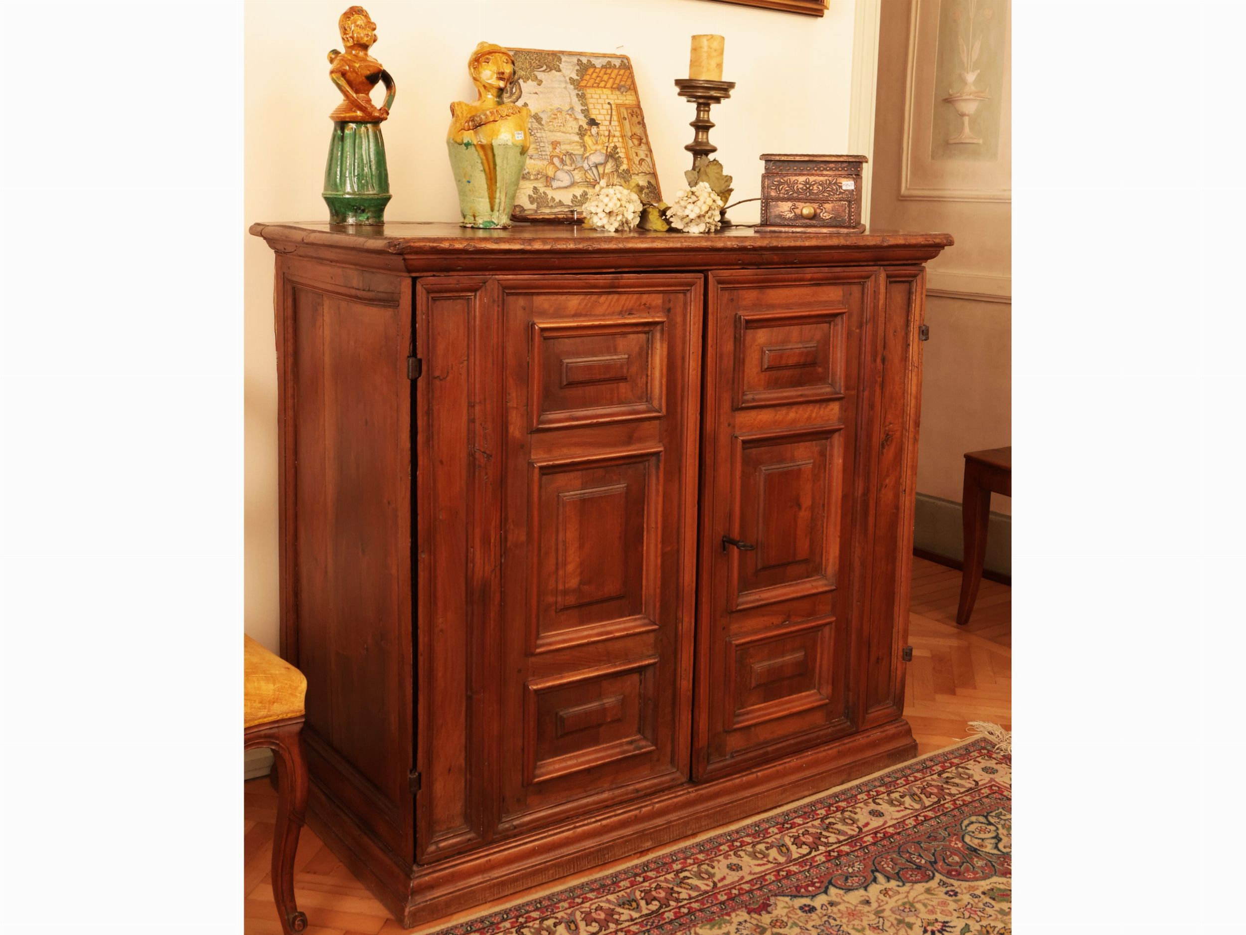 XVIII secolo due sportelli intagliati con formelle in rilievo sul fronte dritto, a celare teoria di quattro cassettini sotto il piano e cinque cassetti sottostanti, base a cornice modanata, alcuni difetti