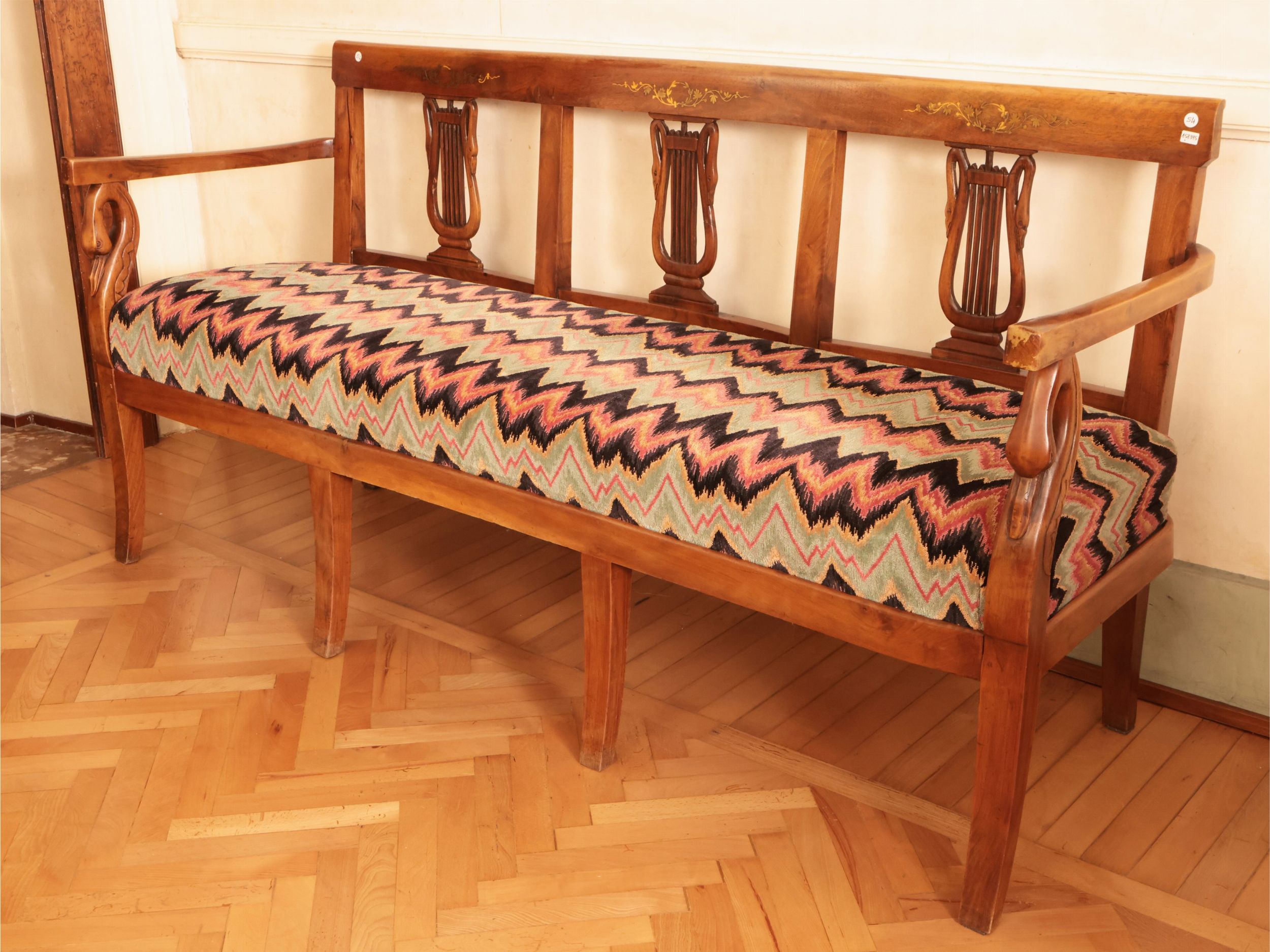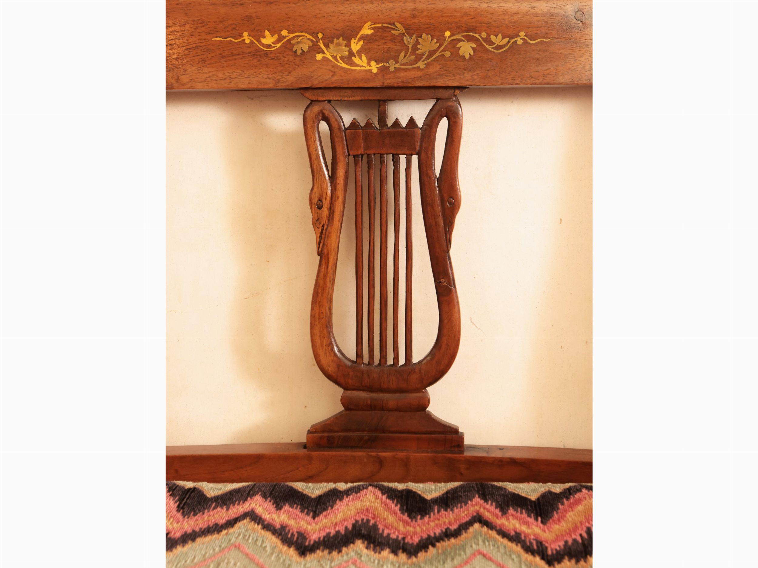 h cm 89x180x54 XIX secolo schienale tripartito intarsiato con tralcio floreale lumeggiato oro, cartelle traforate con motivo a lira, braccioli a giorno con finale a collo di cigno, otto gambe a sciabola, sedile rivestito in tessuto fiammato nei toni del rosa, del blu e dell'azzurro