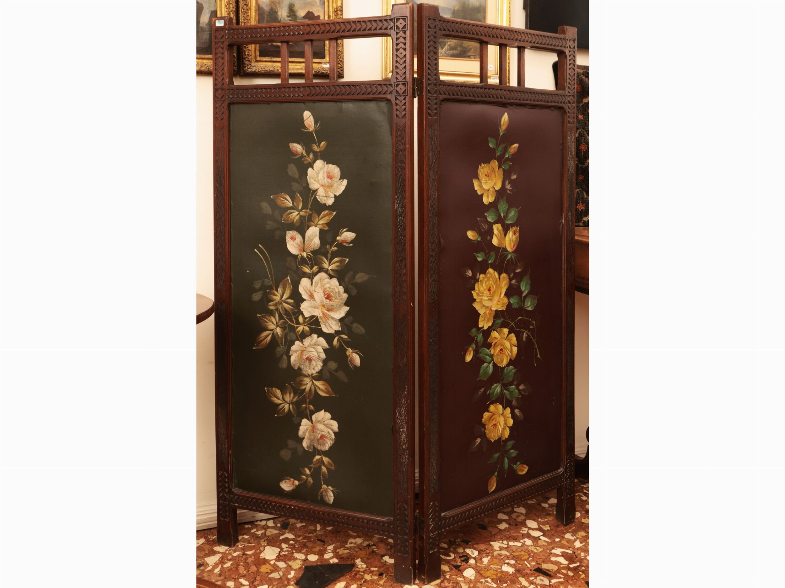 fine del XIX/inizio del XX secolo ciascuna anta dipinta ad olio su tela con motivo di tralcio di rose bianche su fondo verde oliva una, l'altra con rose gialle su fondo magenta, struttura in mogano intagliato con rombi, alcuni difetti