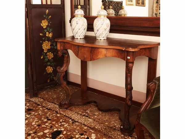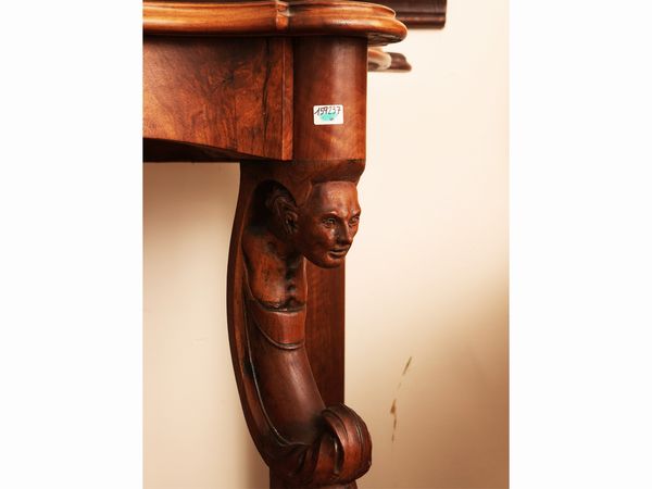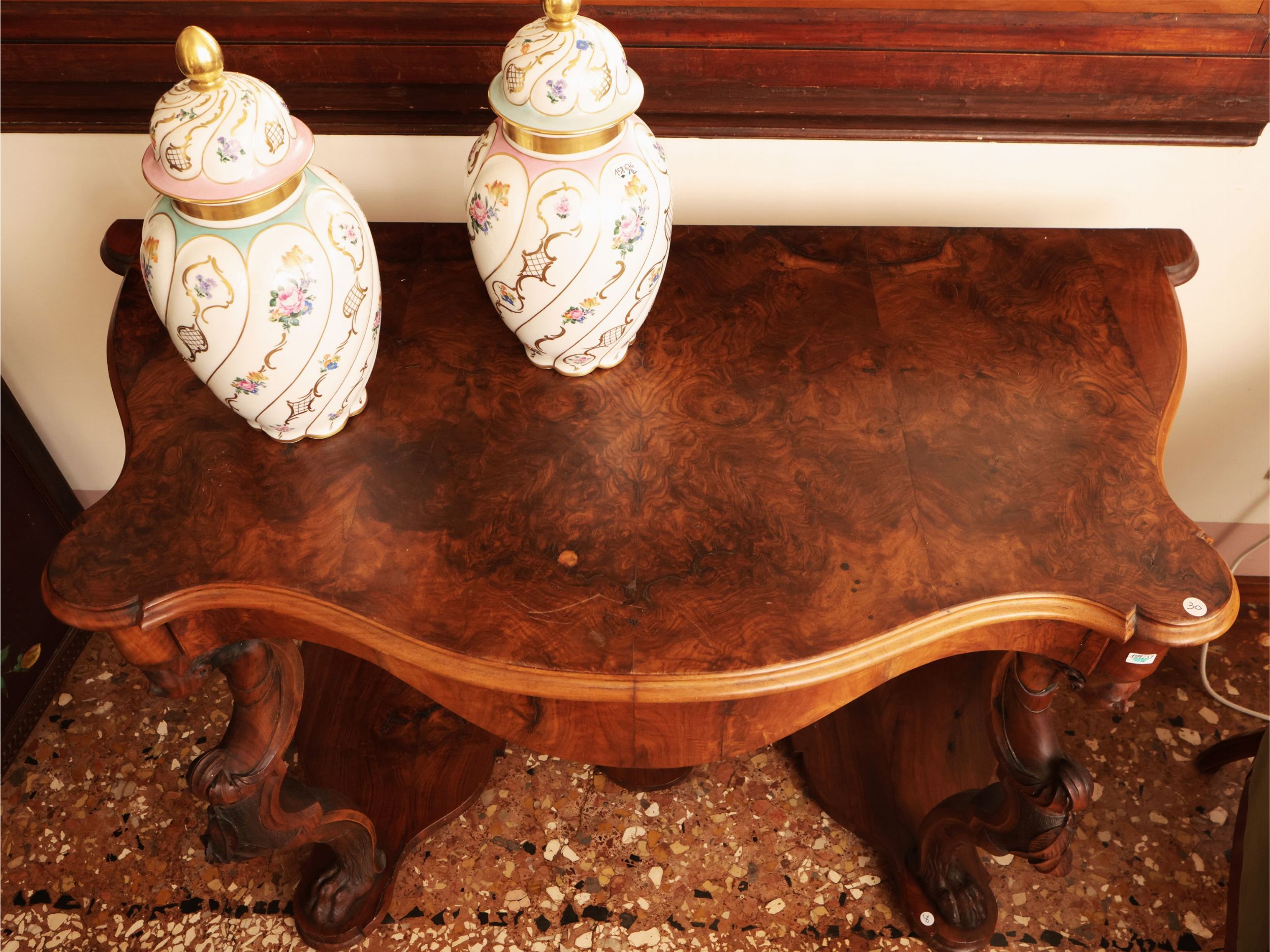 metà del XIX secolo piano sagomato e bordo mosso, gambe anteriori antropomorfe con piedi ferini riunite alle posteriori a colonna piatta da piano sagomato