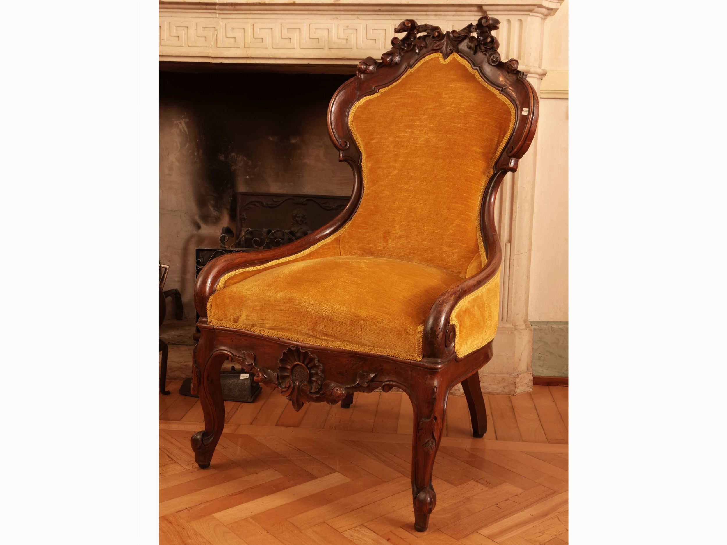 seconda metà del XIX secolo intagliata con motivo di foglie e volute vegetali, imbottita e rivestita in velluto giallo oro, dettagli in passamaneria, gambe mosse