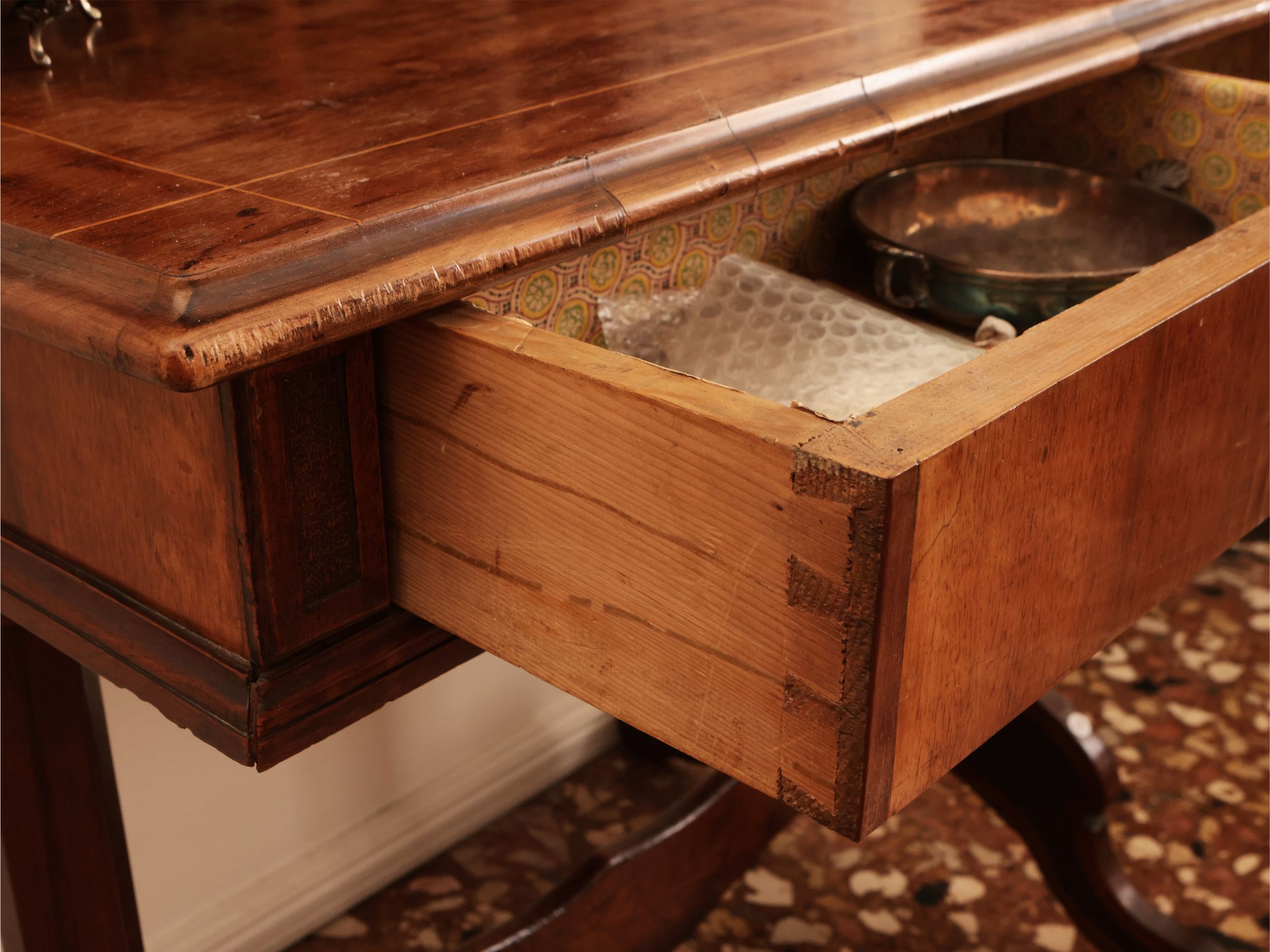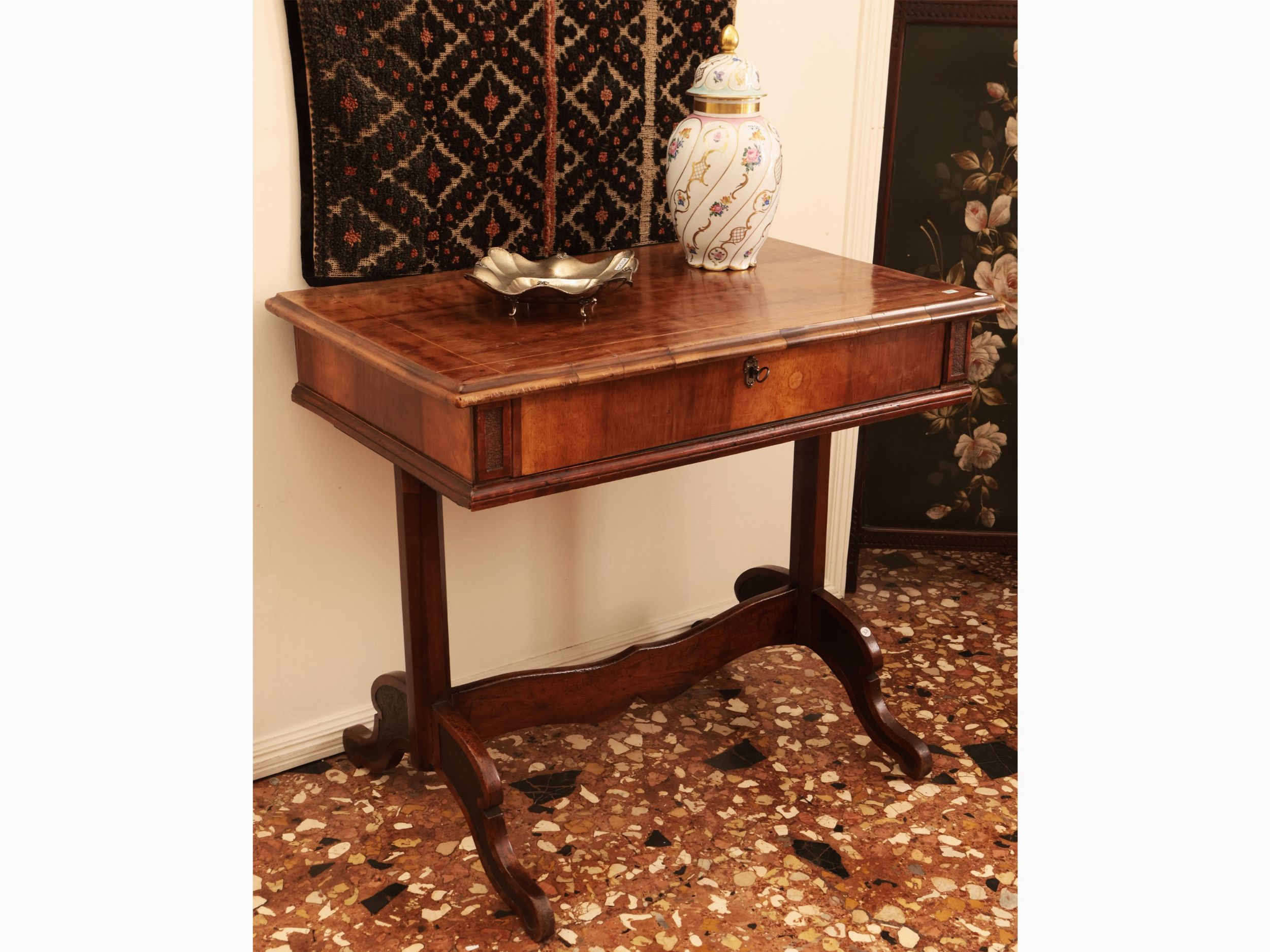 metà del XIX secolo piano intarsiato in altre essenze con sottili filettature, un cassetto nella fascia, due sostegni a doppia voluta riuniti da traversa
