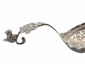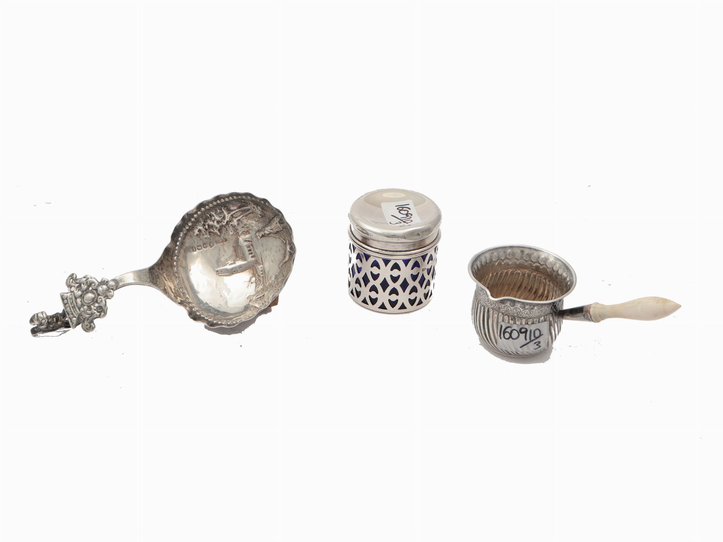 una piccola scatolina cilindrica con corpo traforato con motivo a grata, Città di Sheffield 1898, una bugia sbalzata con veduta di città e stemma ed un piccolo scaldavivande