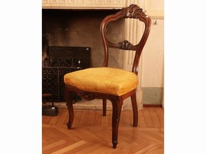 h cm 94x49x49 (2) metà del XIX secolo cartella intagliata con cartiglio, gambe anteriori mosse, sedile imbottito [..]