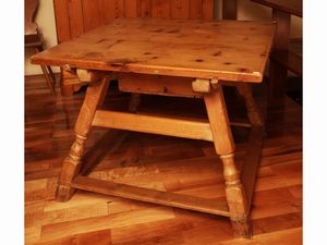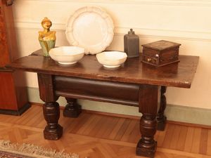 h cm 68x150x70 costruito con materiale antico, gambe tornite con motivo a vaso, alcuni difetti