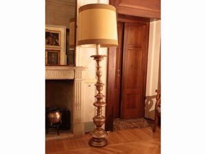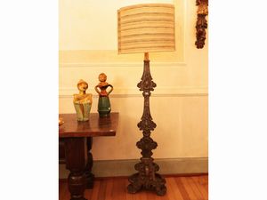 h cm 65 XVIII secolo rivestita in tole sbalzata con motivo di volute vegetali, corredata di paralume in tessuto [..]