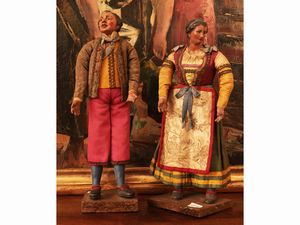 h cm 31 XIX secolo una coppia di villani, volti dipinti realisticamente, abiti in varie tipologie di tessuto, [..]