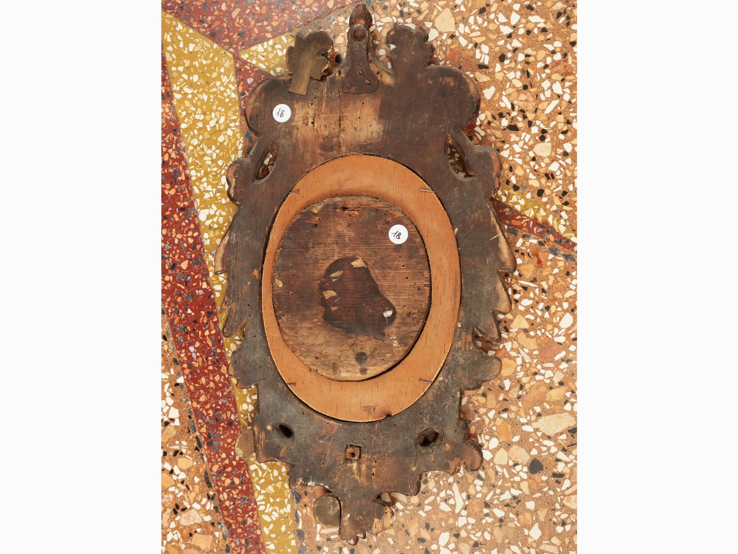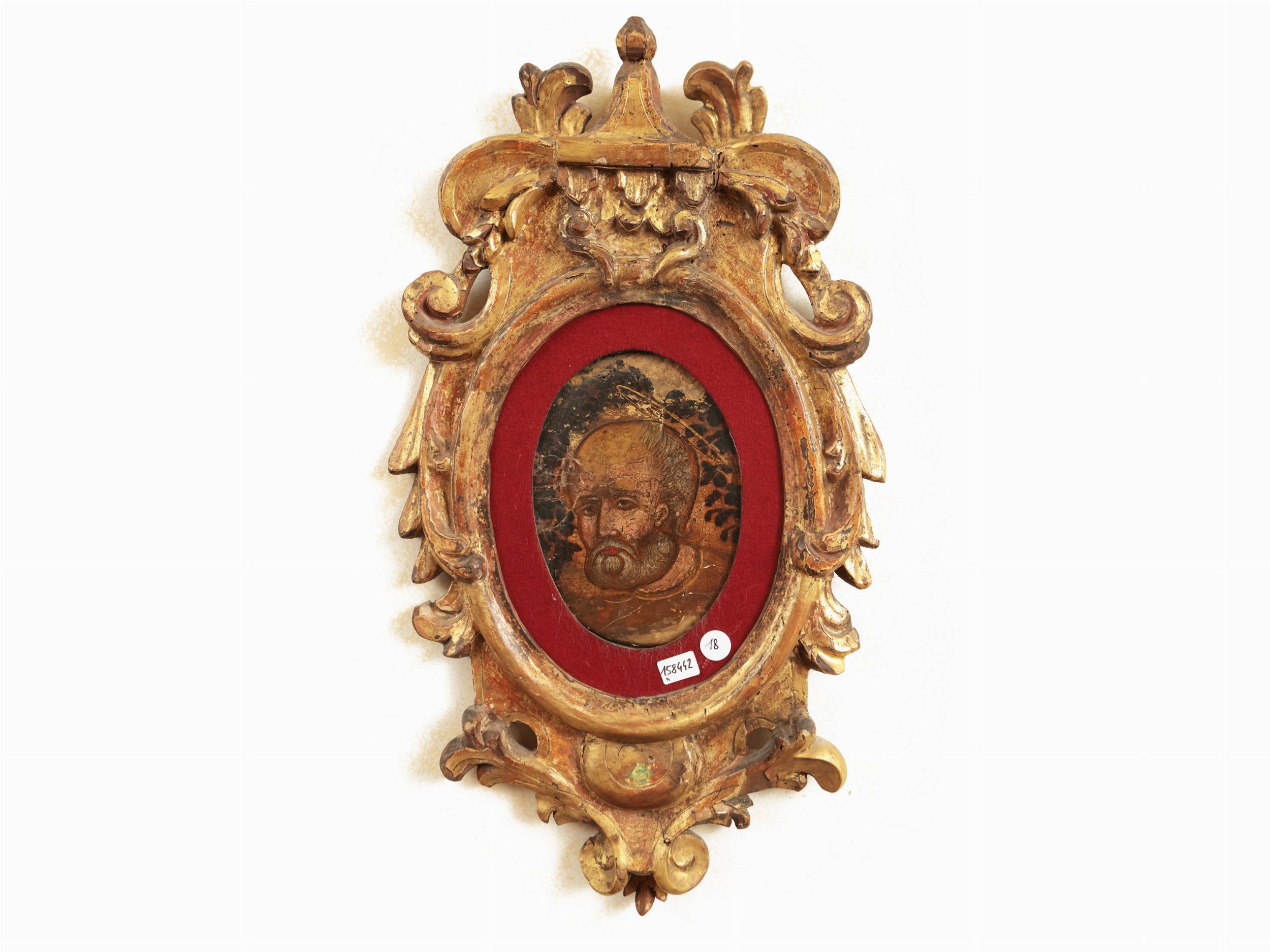 Scuola veneto-cretese del XVIII/XIX secolo tempera su tavoletta in ovale, probabilmente frammento di una più ampia composizione, entro cornice coeva a tempietto in legno intagliato e dorato