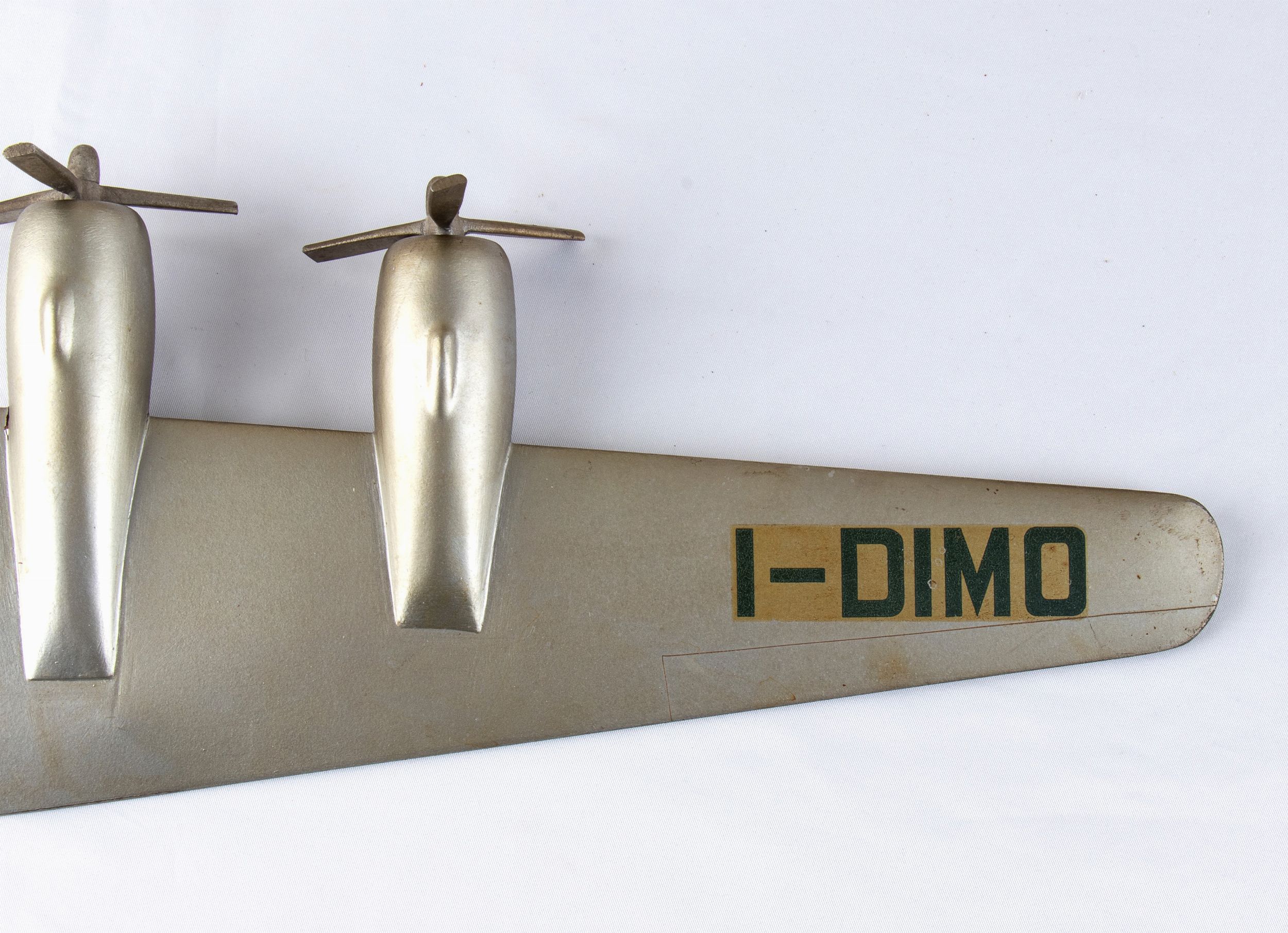 Struttura della fusoliera realizzata in lega di metallo, ali in lamiera scatolata amovibili mediante viti di fissaggio, con due eliche tripala per parte, rotanti, su supporto originale in lega metallica dipinta di nero. Apertura alare del modello circa cm.71, lunghezza da muso a coda cm.62. Altezza del piedistallo/base cm.19 circa. Verniciato a fuoco, livrea a decalcomanie fissate a caldo, in ottime condizioni, con normali usure e segni del tempo, lievi mancanze al timone di coda.