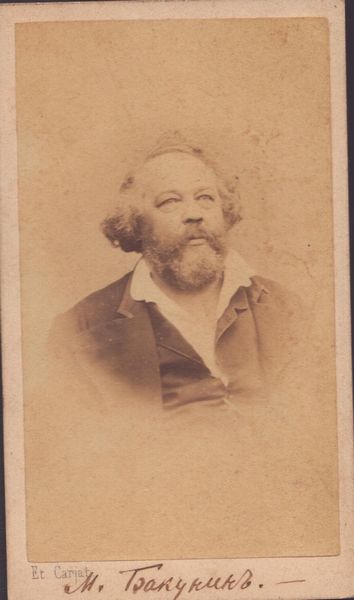 Foto formato CDV di Mikhail Bakunin, con un autografo ad inchiostro nero, in caratteri cirillici. La foto è firmata Carjat & C., montato su cartoncino. Originale, lievi bruniture sparse date dal tempo, in ottime condizioni. Misura circa cm.6,3x10,7
