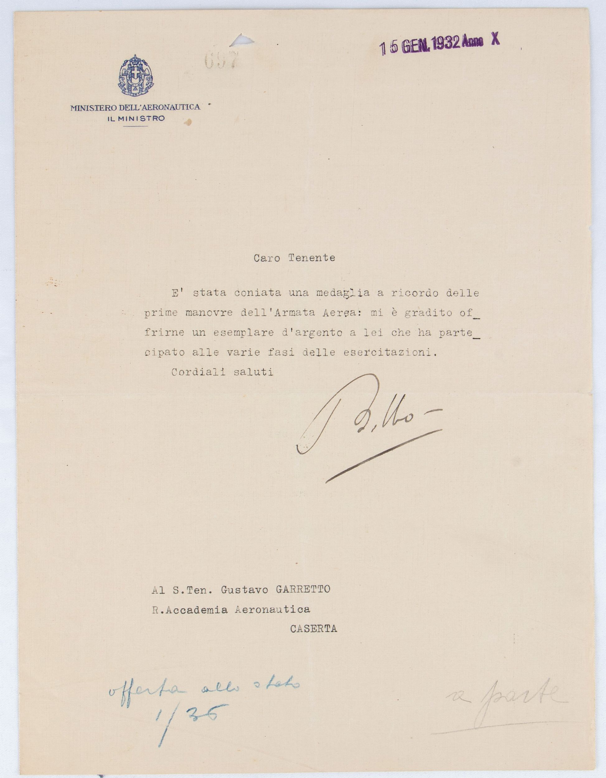 La lettera parla della istituzione della medaglia a ricordo delle manovre dell'Armata Aerea, ed il ministro Balbo ne offre un esemplare d'argento al tenente della Regia Accademia Aeronautica che ne prese parte.