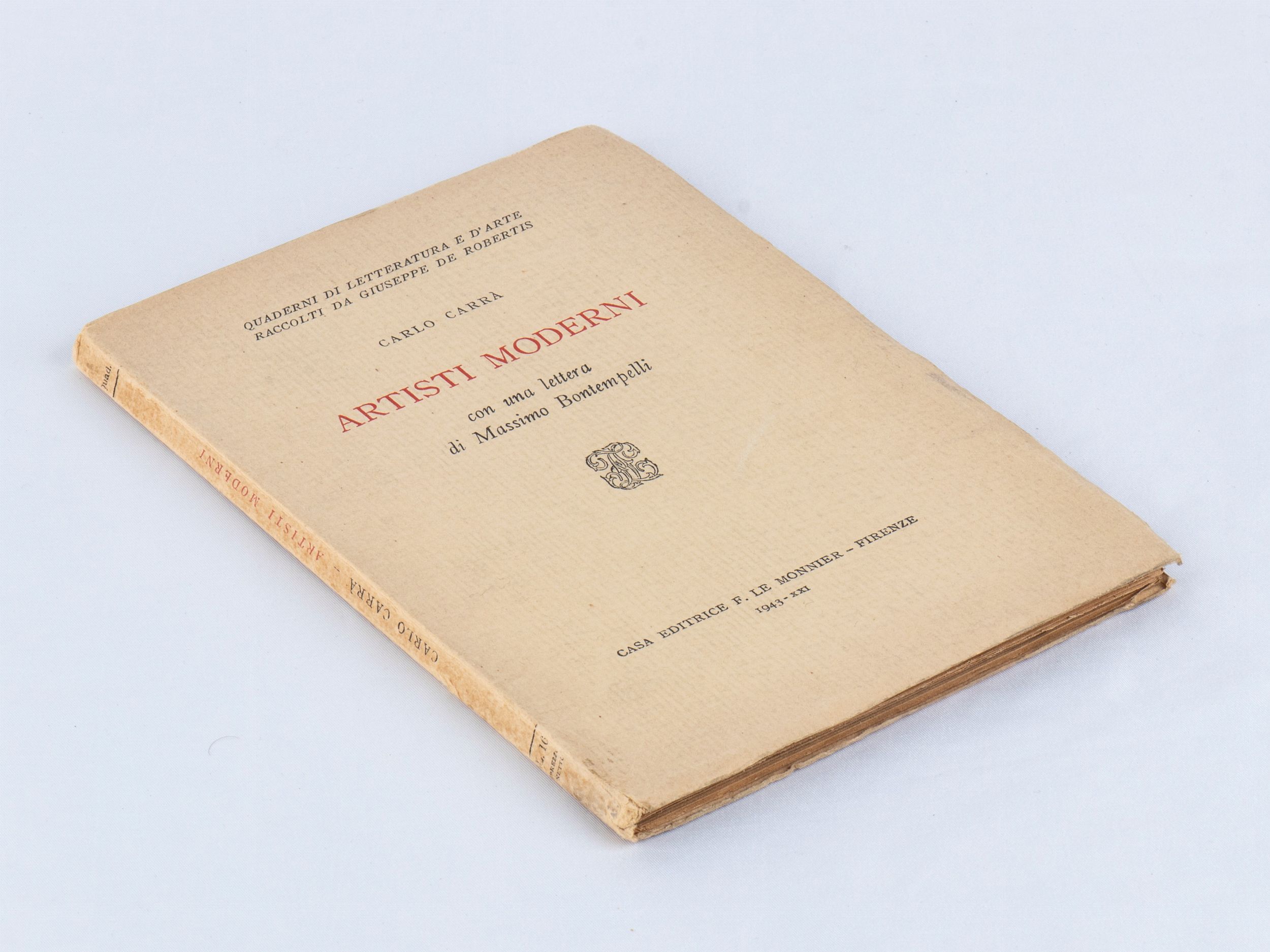 Dedica e firma autografe di Carlo Carrà sul volume Artisti moderni - con una lettera di Massimo Bontempelli, scritti ad inchiostro nero, indirizzata al Vico Pellizzari senatore del Regno, 1943