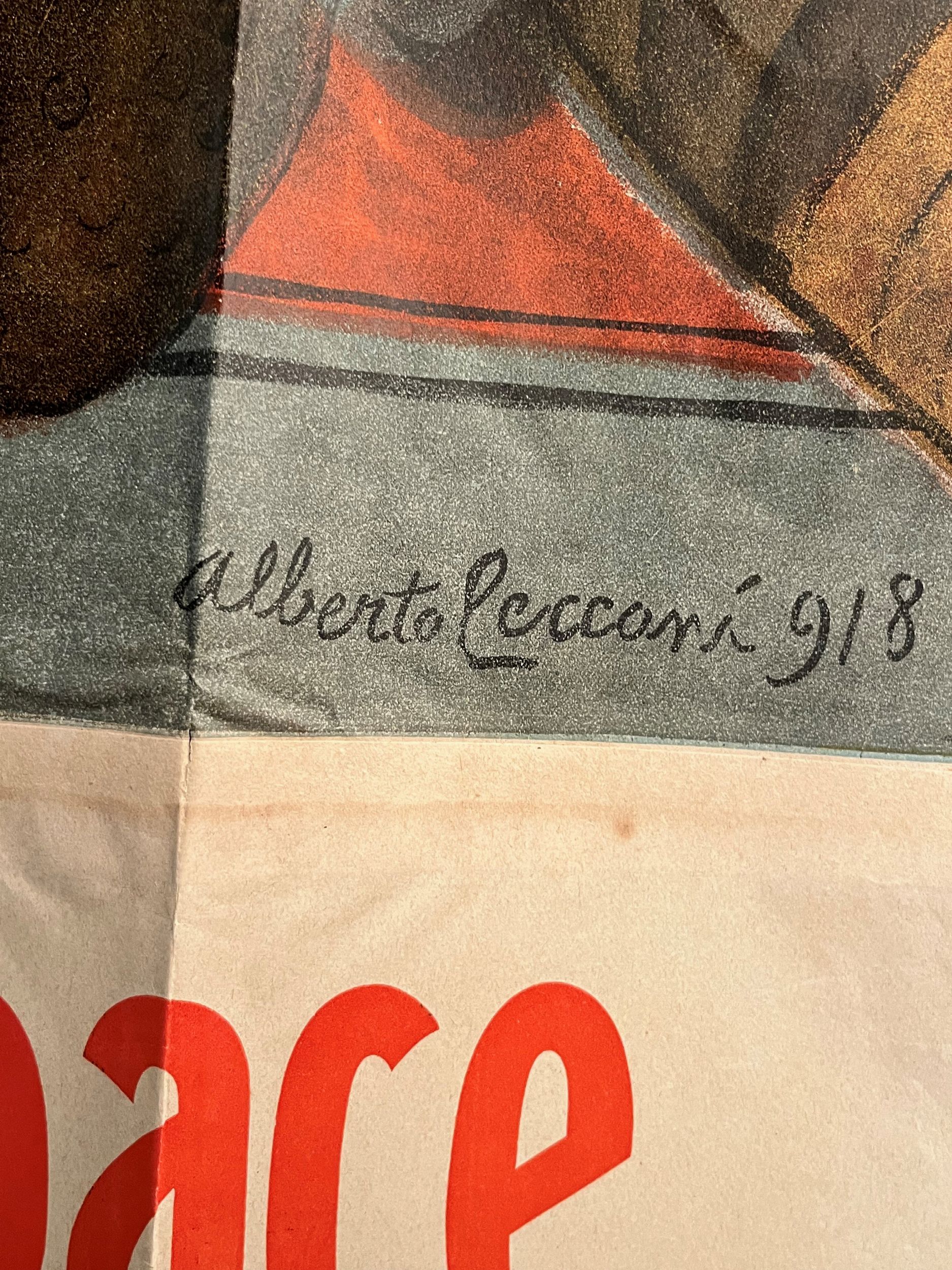 Manifesto originale stampa offset litografico, propaganda Prima Guerra Mondiale dal titolo COME FU APERTA LA PORTA DELLA PACE disegnato da Alberto Cecconi nel 1918, firmato in basso a sinistra. Evidenti e chiare allusioni erotiche, all'apertura e alla penetrazione nelle difese nemiche austro ungariche. Due soldati dell'alleanza europea, un italiano ed un inglese, si scagliano alla baionetta contro la porta del nemico, squarciandola nel mezzo.