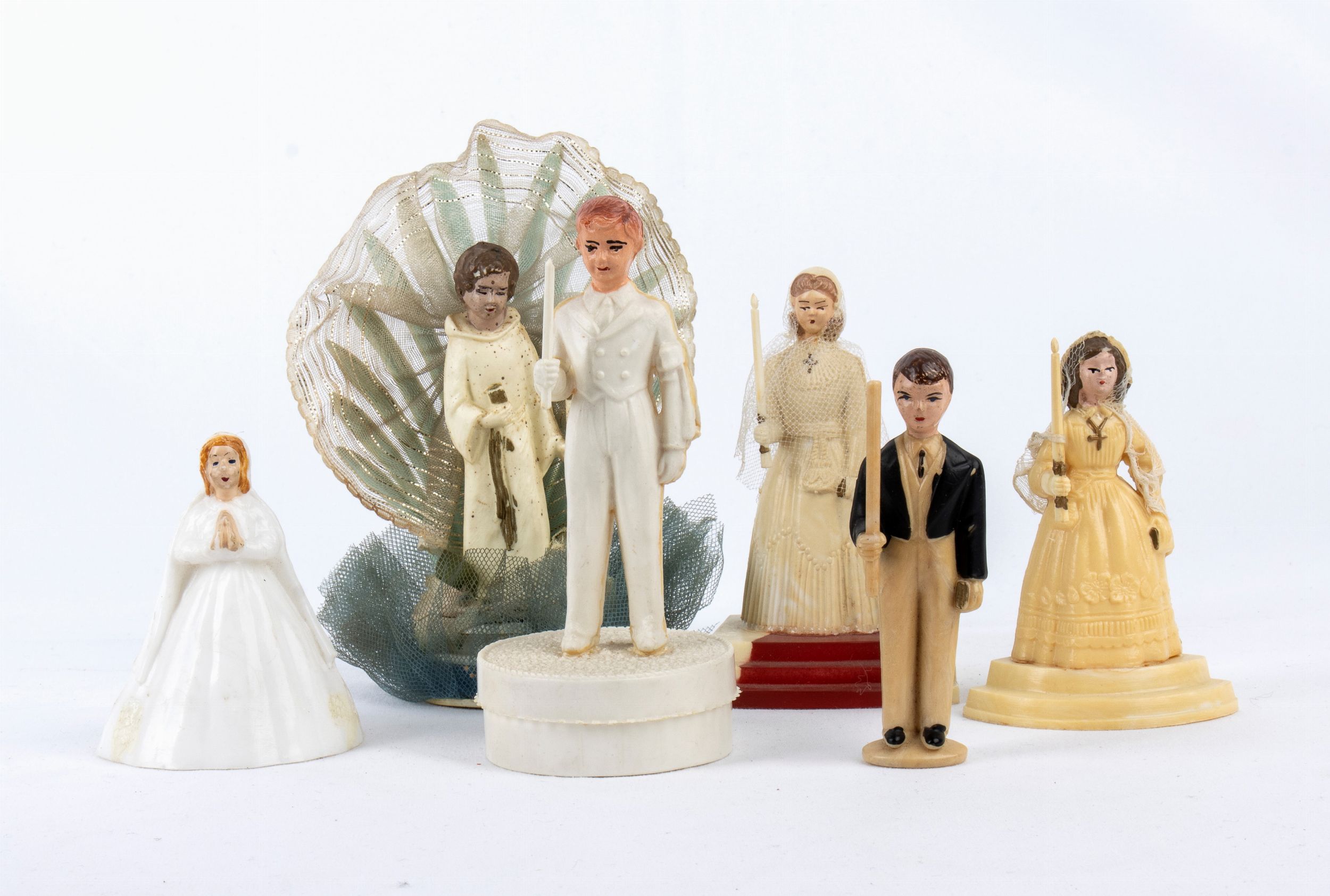 1910-1950 Lotto di 6 figurine di comunicandi bambini e bambine, in abito da cerimonia, plastica e accessori, metà XX secolo. Misure cm.7 - 15. In buone condizioni