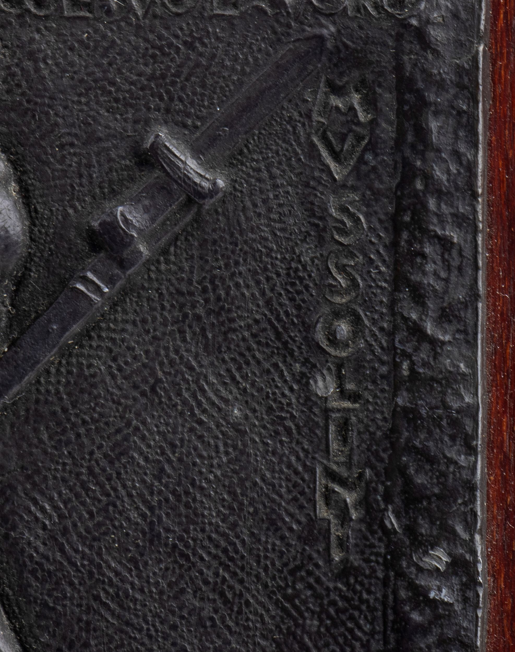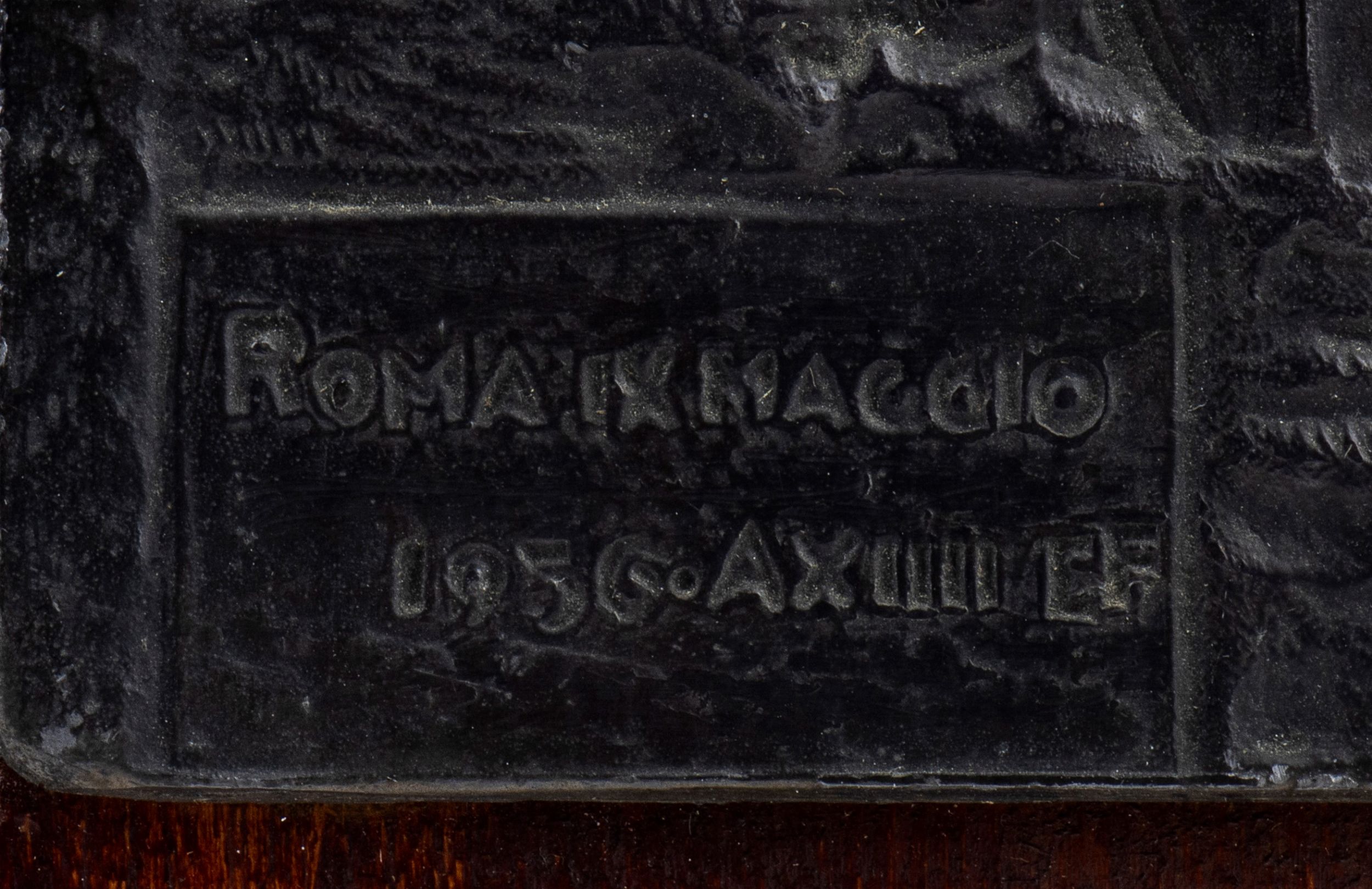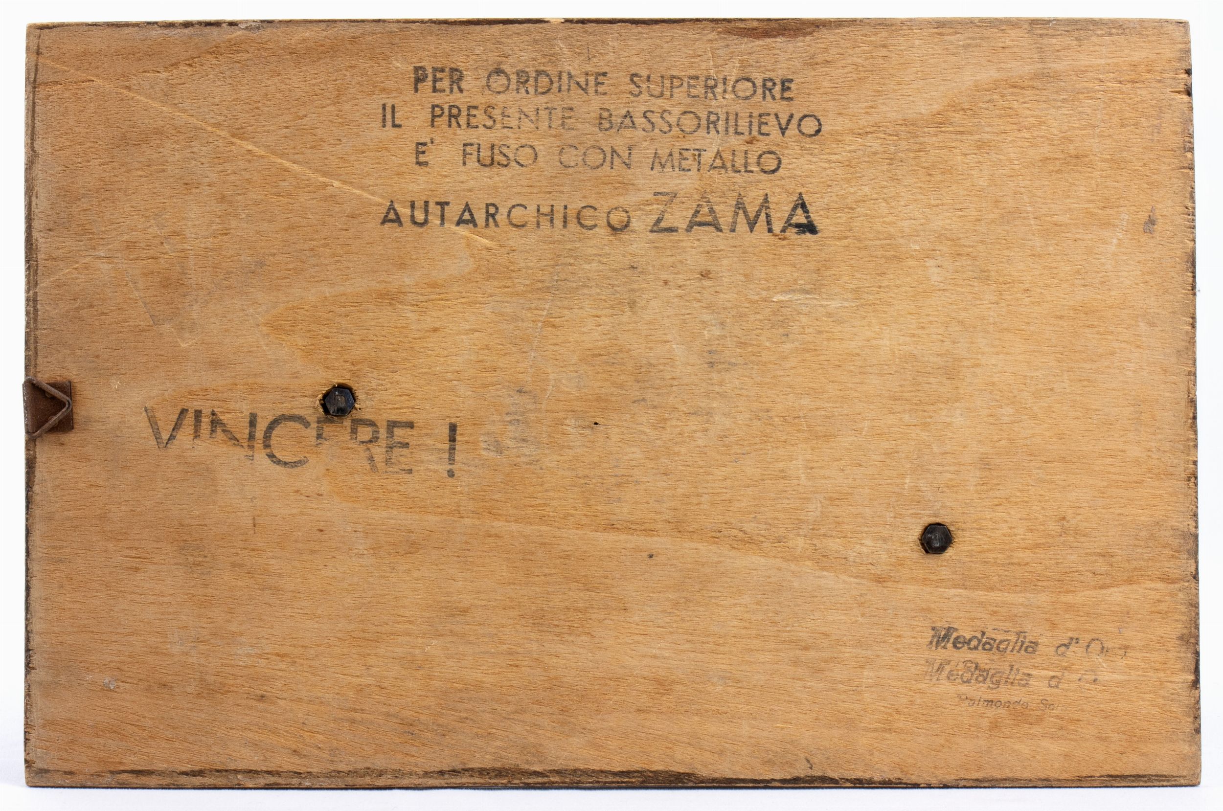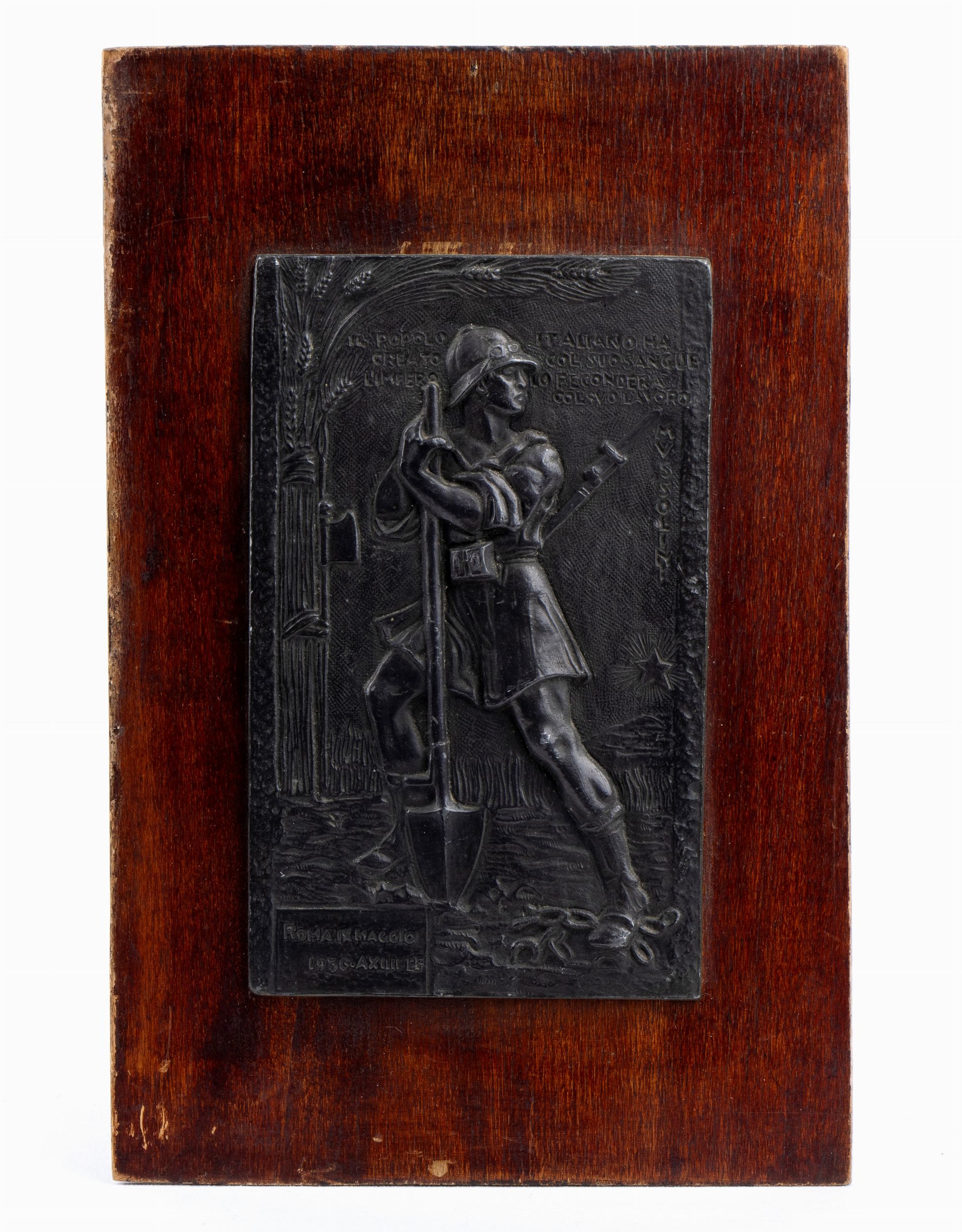 Placca commemorativa della fondazione dell'Impero in Africa del 1936. Raffigura un soldato in uniforme coloniale, armato di moschetto e vanga, con le iscrizioni IL POPOLO ITALIANO HA CREATO COL SANGUE IL SUO IMPERO LO FECONDERA' COL LAVORO -MUSSOLINI - ROMA 9 MAGGIO 1936 A.XIIII E.F. (Il 9 maggio, Mussolini annunciò la fondazione dell'impero: Vittorio Emanuele III assunse il titolo di imperatore d'Etiopia, mentre il generale Badoglio venne nominato viceré dell'Etiopia e governatore generale dell'Africa Orientale Italiana). Placca realizzata in fusione autarchica, montata d'origine su basetta in legno, recante al retro i timbri originali PER ORDINE SUPERIORE IL PRESENTE BASSORILIEVO E' FUSO CON METALLO AUTARCHICO ZAMA - VINCERE! - Medaglia d'oro. Misure approssimative della placca cm.10,5 x 17, in ottime condizioni