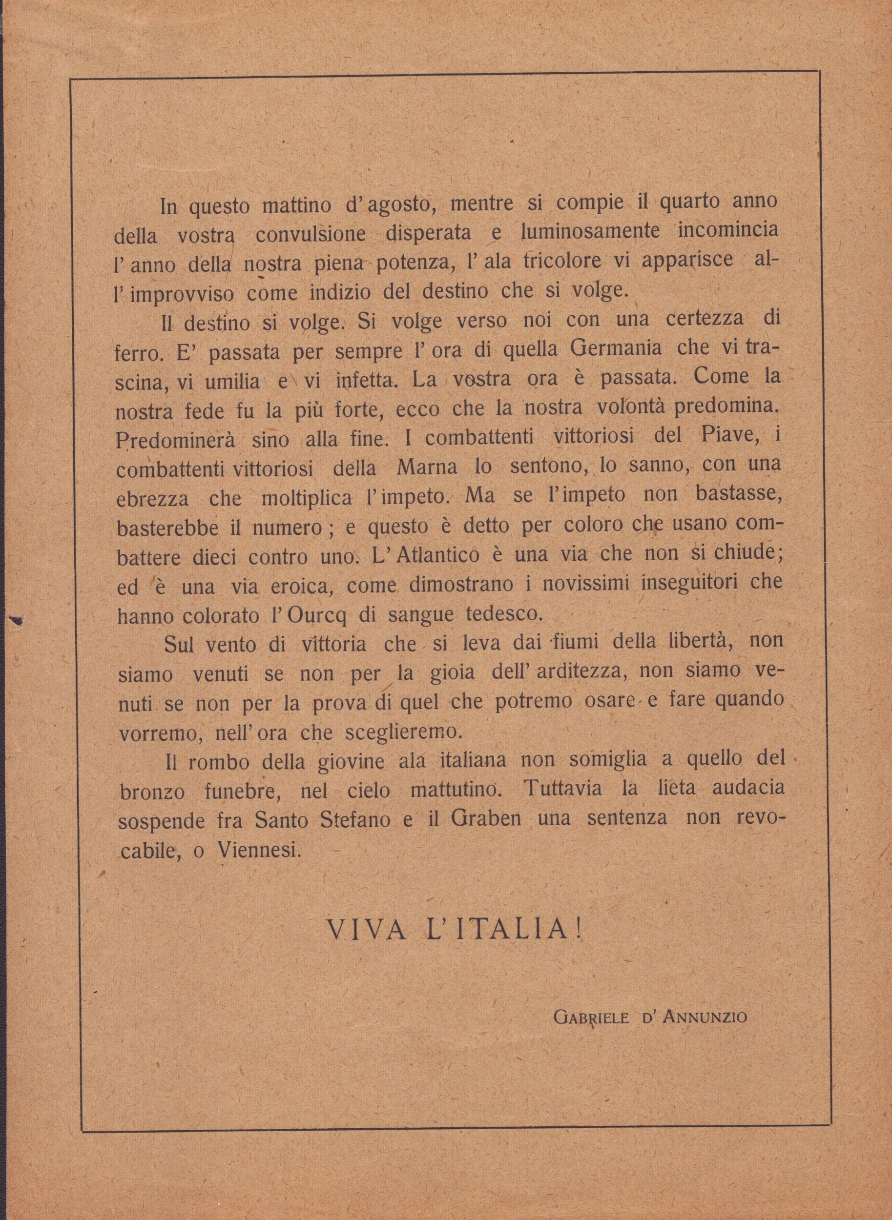 In questo mattino d'agosto, mentre si compie il quarto anno della vostra convulsione disperata e luminosamente incomincia l'anno della nostra piena potenza, l'ala tricolore vi apparisce all'improvviso come indizio del destino che si volge. Il destino si volge. Si volge verso di noi con una certezza di ferro. È passata per sempre l'ora di quella Germania che vi trascina, vi umilia e vi infetta. La vostra ora è passata. Come la nostra fede fu la più forte, ecco che la nostra volontà predomina e predominerà sino alla fine. I combattenti vittoriosi del Piave, i combattenti vittoriosi della Marna lo sentono, lo sanno, con una ebbrezza che moltiplica l'impeto. Ma, se l'impeto non bastasse, basterebbe il numero; e questo è detto per coloro che usano combattere dieci contro uno. L'Atlantico è una via che già si chiude; ed è una via eroica, come dimostrano i nuovissimi inseguitori che hanno colorato l'Ourcq di sangue tedesco. Sul vento di vittoria che si leva dai fiumi della libertà , non siamo venuti se non per la gioia dell'arditezza, non siamo venuti se non per la prova di quel che potremmo osare e fare quando vorremo, nell'ora che sceglieremo. Il rombo della giovane ala italiana non somiglia a quello del bronzo funebre, nel cielo mattutino. Tuttavia la lieta audacia sospende fra Santo Stefano e il Graben una sentenza non revocabile, o Viennesi. Viva l'Italia!