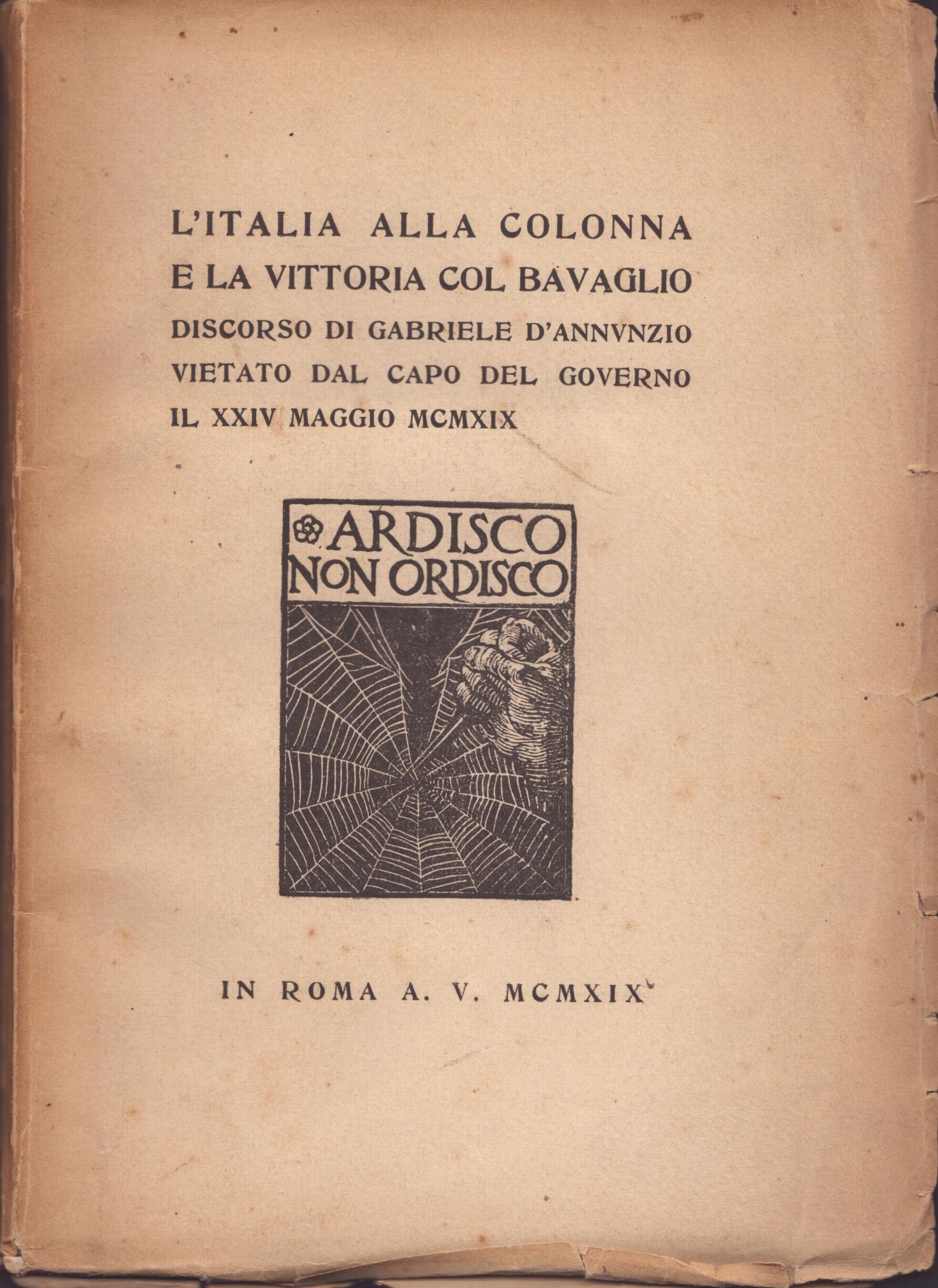 Raro volumetto L'ITALIA ALLA COLONNA E LA VITTORIA COL BAVAGLIO - DISCORSO DI GABRIELE D'ANNUNZIO VIETATO DAL CAPO DEL GOVERNO IL XXIV MAGGIO MCMXIX in 1' edizione speciale di 99 esemplari , questa recante il numero 4 a timbro azzurro, con dedica interna A RENATA IL SUO GABRIEL - Renata fu la figlia di Gabriele d'Annunzio, nata a Resina ( Na ) nel 1893 dalla relazione fra d'Annunzio e Maria Gravina Cruyllas sposata al conte Guido Anguissola. Figlia molto amata dal Poeta che la chiamava affettuosamente “Cicciuzza” - Formato 16° cm.20,5x14 , pagine 50 con illustrazione xilografica di Alfredo De Carolis ARDISCO NON ORDISCO in prima di copertina, e MEMENTO AUDERE SEMPRE in ultima. Brossura editoriale ad ampi margini, in barbe, con pieghe e leggeri strappi. Invettiva contro la Conferenza di Pace ed il Primo Ministro Orlando, testo apparso ed ampiamente censurato ne L'idea Nazionale del 26/5/1919 con il titolo La celebrazione del XXIV Maggio nell'orazione di Gabriele d'Annunzio. Italia, in te sola ! - Questo opuscolo, libricino, fu stampato clandestinamente in Roma nel 1919. Brossura editoriale, in barbe, condizioni buone, pagine integre, pieghe e strappetti alle barbe, dedica e firma originali vergate di pugno da Gabriele d'Annunzio, ad inchiostro nero.