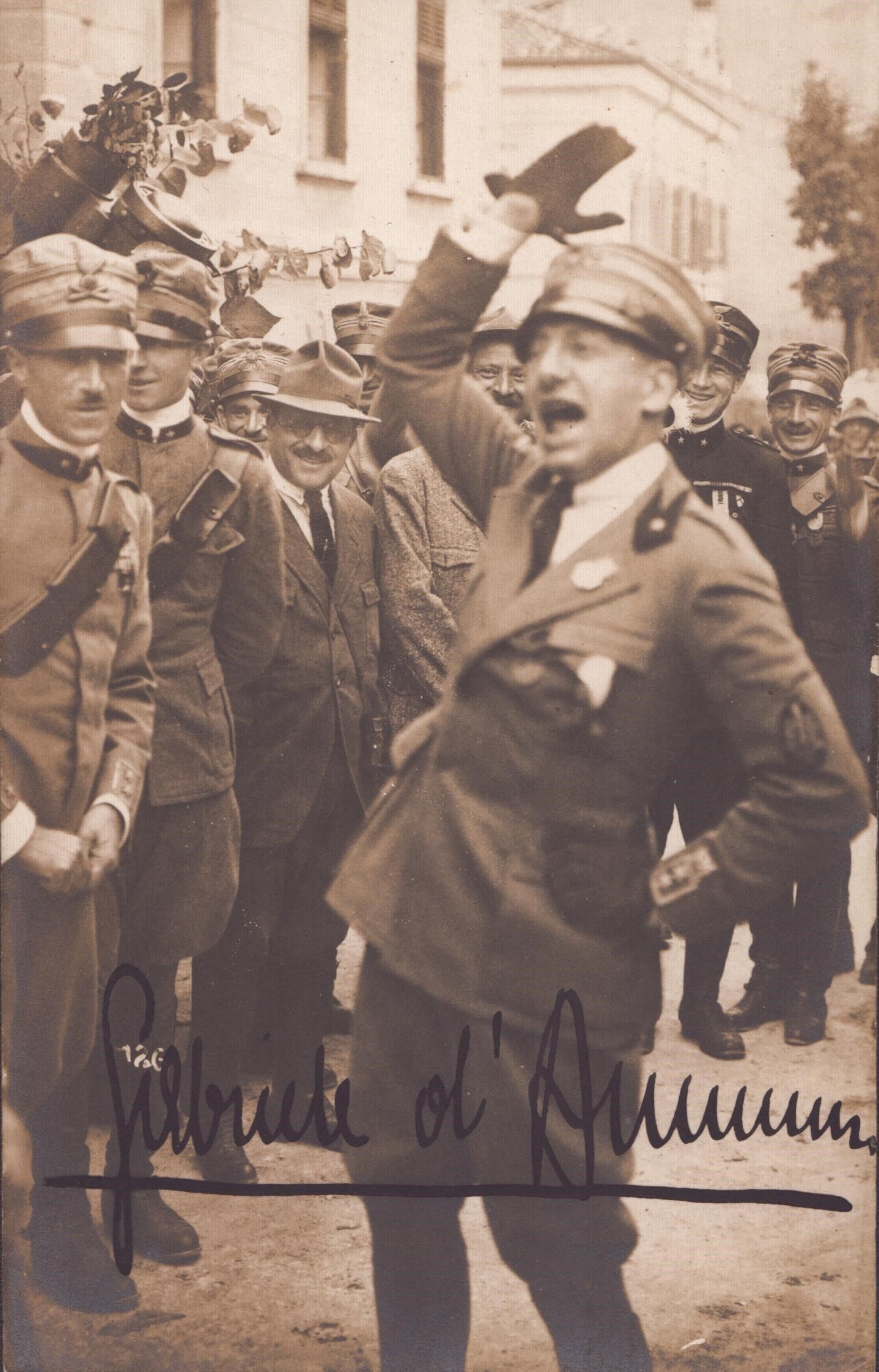 cm.8,5x13,6 Foto cartolina b/n con il Vate in uniforme da Ardito , epopea fiumana, che intrattiene legionari e cittadini, autografata in calce ad inchiostro nero. Misure cm.8,5x13,6 ottime condizioni