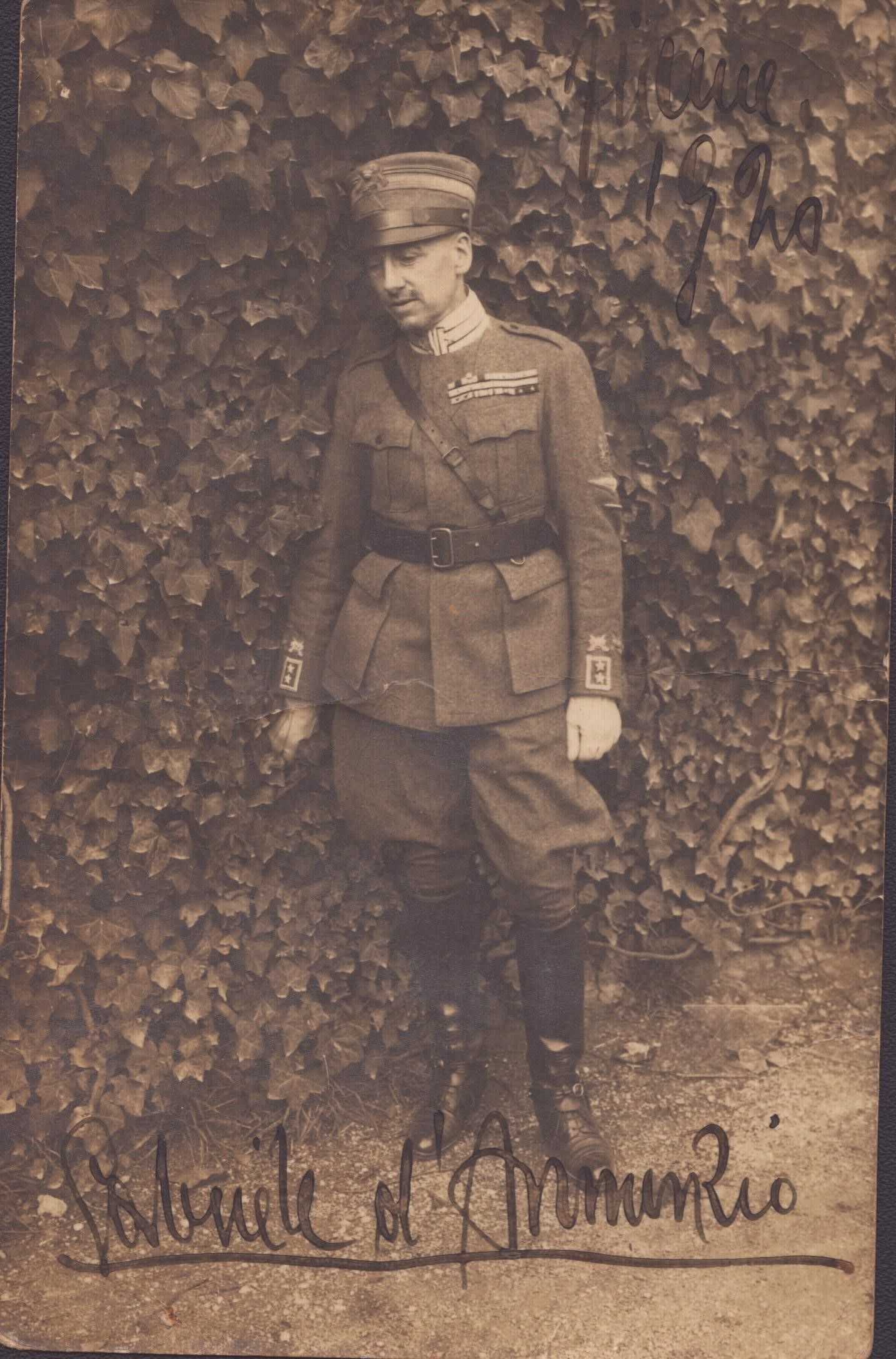 cm.9x14 Foto cartolina b/n con il Vate in uniforme da Tenente Colonnello dei Lancieri di Novara, fregio da Ardito al braccio sinistro, con iscrizione autografa FIUME 1920 in alto a destra, ed autografata in calce ad inchiostro nero. Misure cm.9x14 ottime condizioni