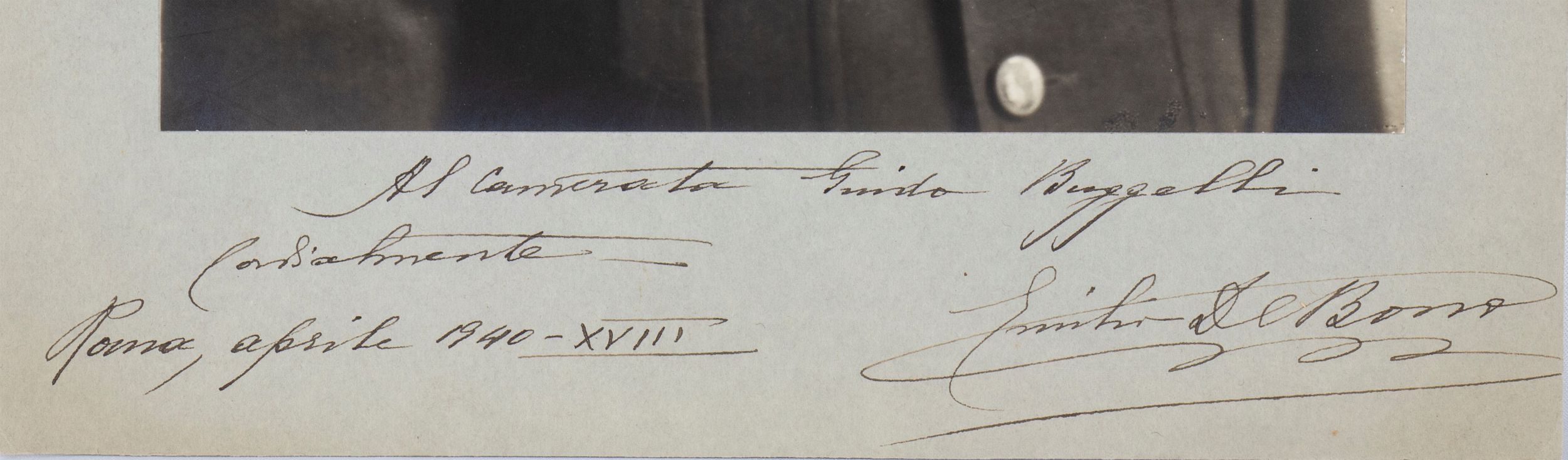 Foto in b/n di Emilio De Bono, Maresciallo d'Italia, primo piano in uniforme con berretto, con dedica e firma autografe ad inchiostro nero. La dedica recita Al Camerata Guido Buggelli - Cordialmente - Roma, aprile 1940 - XVIII