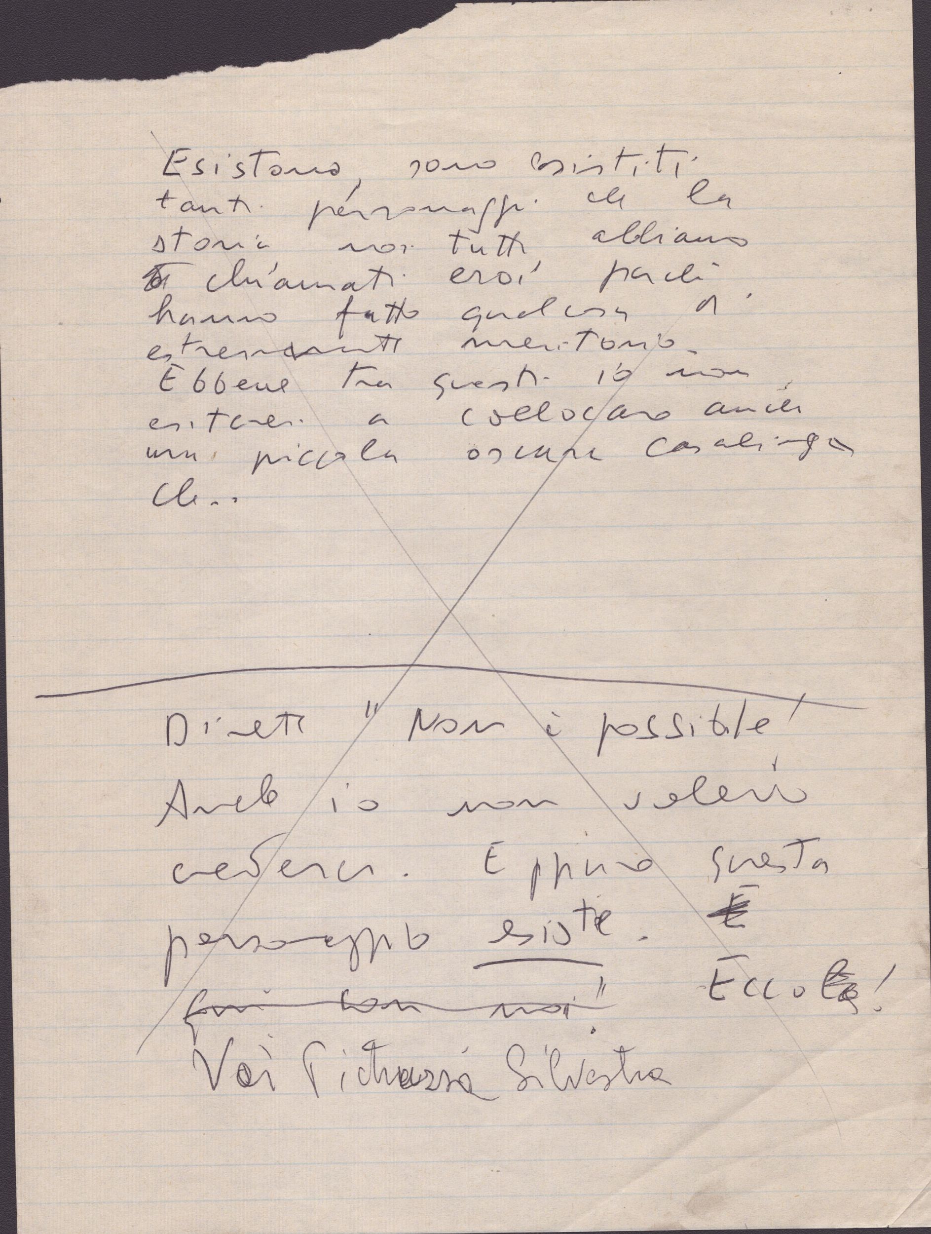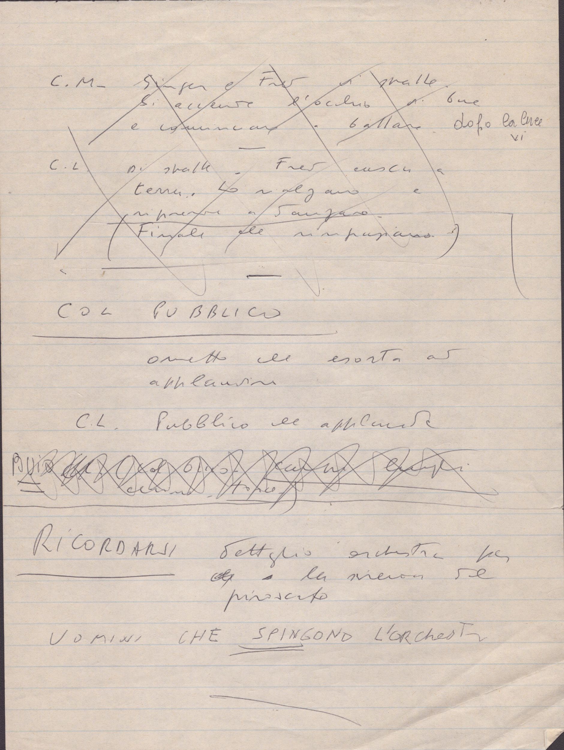 Gli appunti riguardano il film Ginger e Fred (1986) dove Marcello Mastroianni e Giulietta Masina interpretano i ruoli principali, e riportano alcune note del regista per inquadrature di Fabrizi (Nicola, nel ruolo di Aurelio il presentatore) e di scene degli stessi Ginger e Fred (Masina, Mastroianni), con le abbreviazioni P.P. (Primo Piano) C.L. (Campo Lungo) ed ancora C.M.P. e C.M.