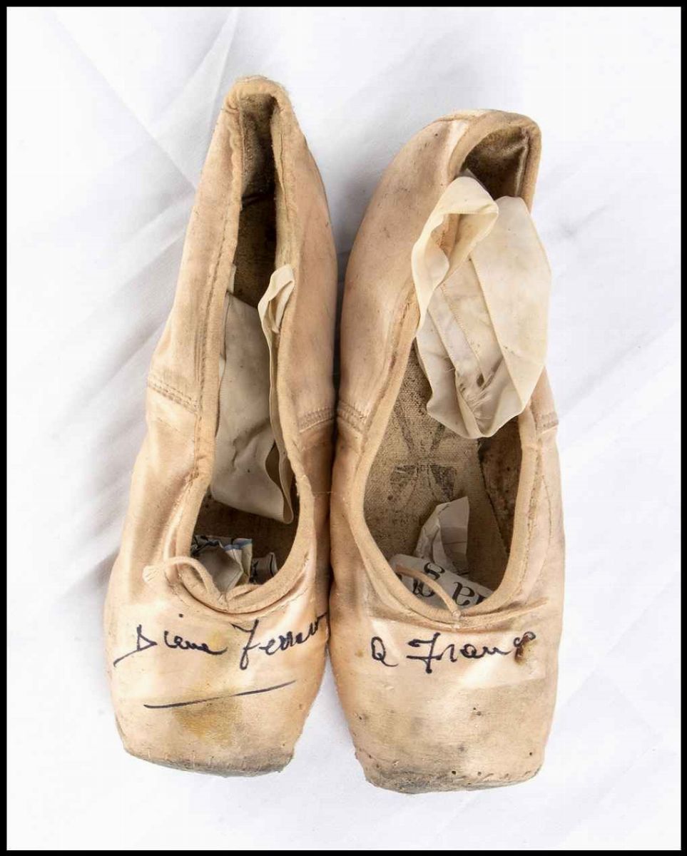 Memorabilia Spettacolo, Cinematografia... Paio di scarpette punte da danza classica, rosa, con dedica ed autografo originali scritti a pennarello nero da Diana Ferrara. Nel 1978 diviene PRIMA BALLERINA ETOILE dell'Opera di Roma.