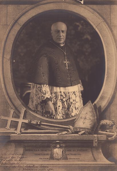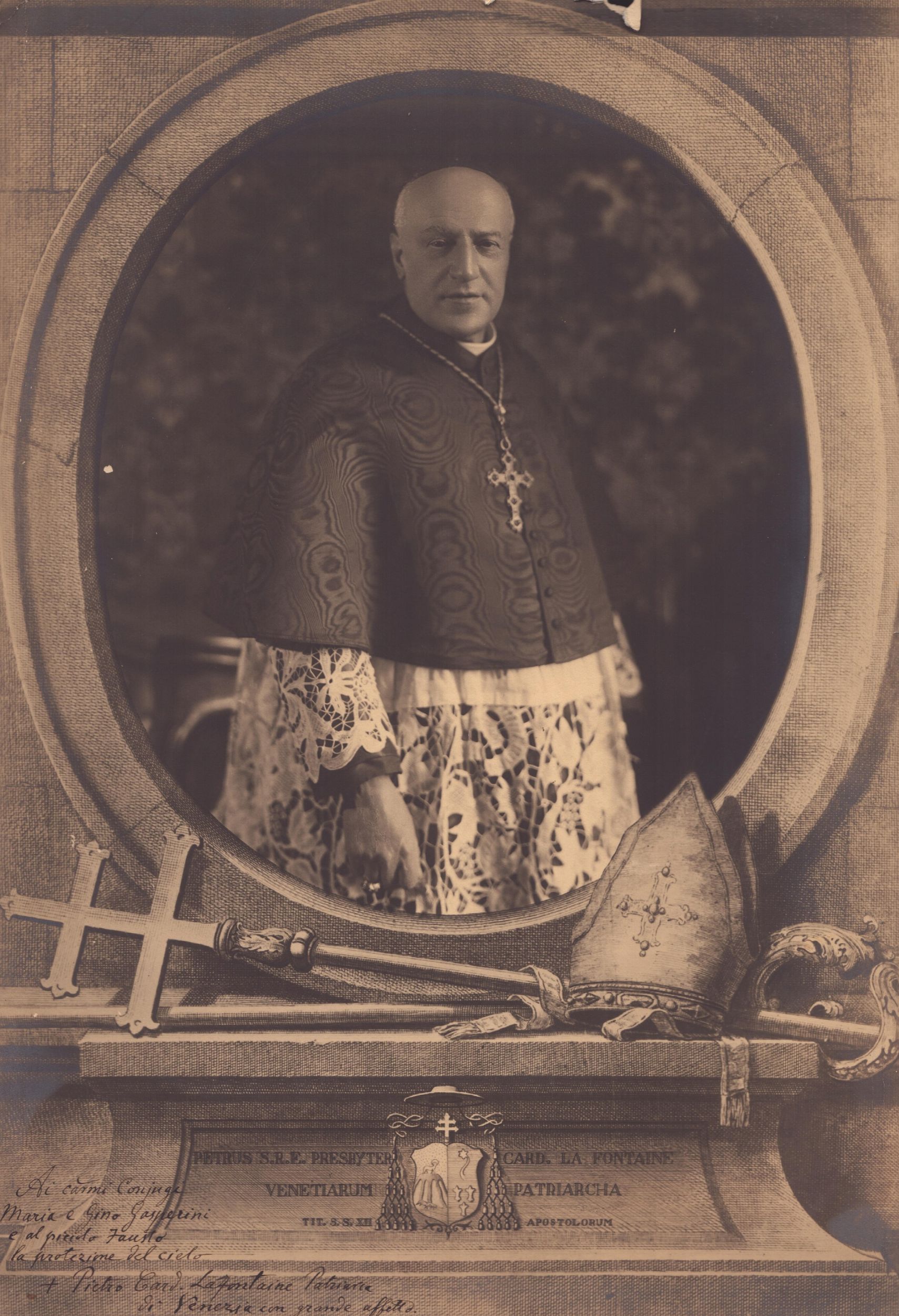 36 x 24,6 cm Fotografia autografata dal cardinale La Fontaine. La dedica riporta: Ai carissimi coniugi Maria e Gino Gasperini e al piccolo Fausto la protezione del cielo. Pietro Card. Lafontaine Patriarca di Venezia con grande affetto. Lievi strappi della fotografia in alto a destra e alcune mancanze a sinistra.