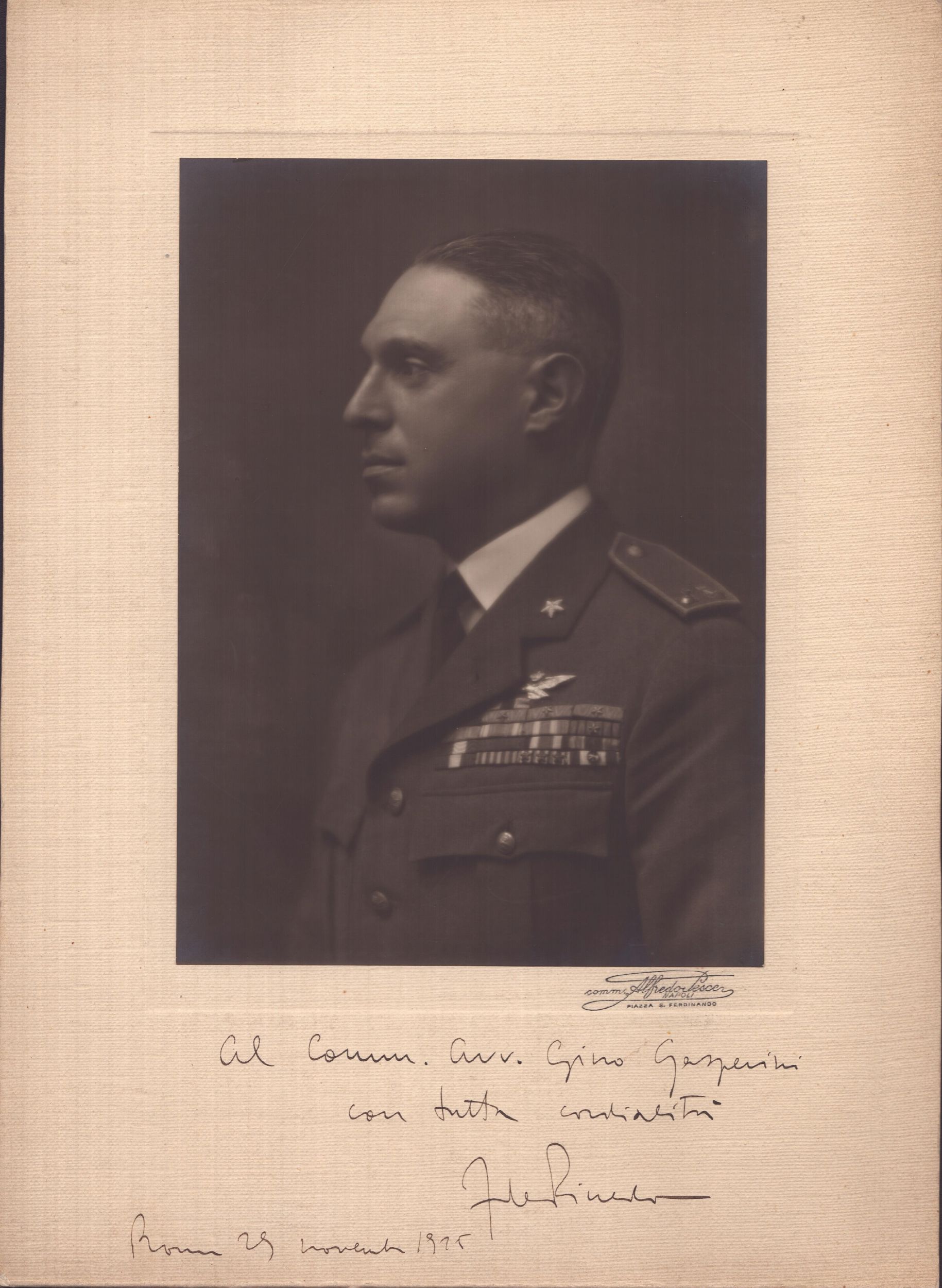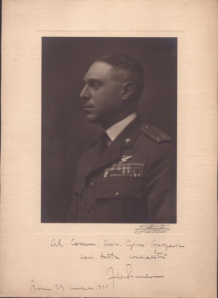 36x26,2 cm 1925 Fotografia incollata su Passepartout recante marchio di Alfredo Pesce, fotografo ufficiale della Real Casa Savoia. Sul Fronte: Al Comm. Avv. Gino Gasperini con tutta cordialità . De Pinedo. Roma 29 novembre 1925. Ottime condizioni.