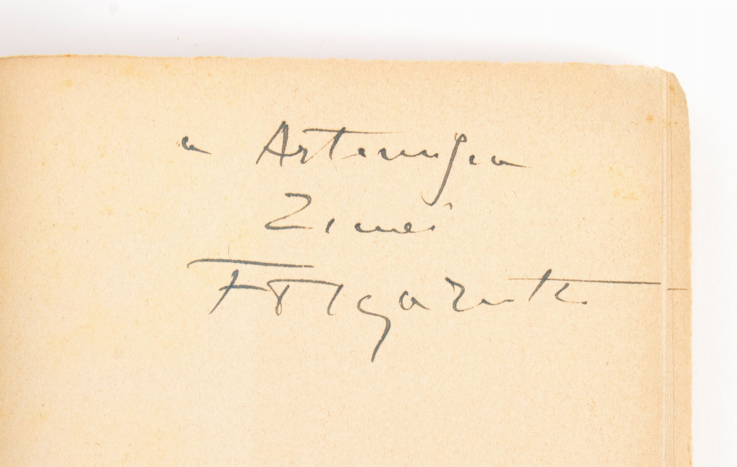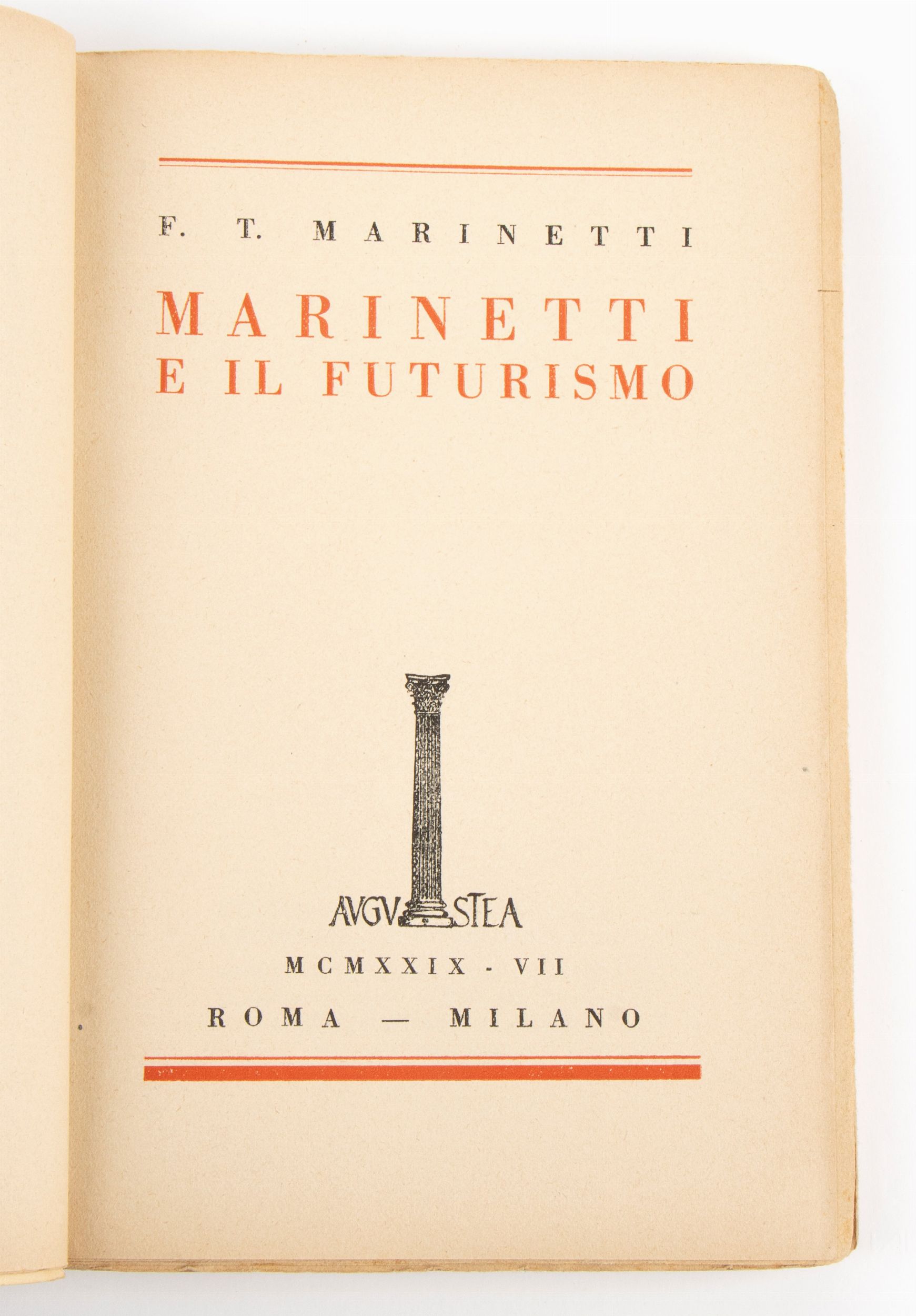 MARINETTI E IL FUTURISMO collana I prefascisti edizioni AUGUSTEA - Di Filippo Tommaso Marinetti (Alessandria d'Egitto, 22 dicembre 1876 – Bellagio, 2 dicembre 1944), brossura, pp.174, rara prima edizione con rara sovracoperta arancione. All'interno dedica ed autografo originali di F.T.Marinetti alla sua amica poetessa Artemisia Zimei. In buone condizioni, appunti a matita della poetessa, piccolo ex-libris applicato alla sovracoperta, lievi segni d'uso strappi alla sovracoperta. Misure cm.19,5x13