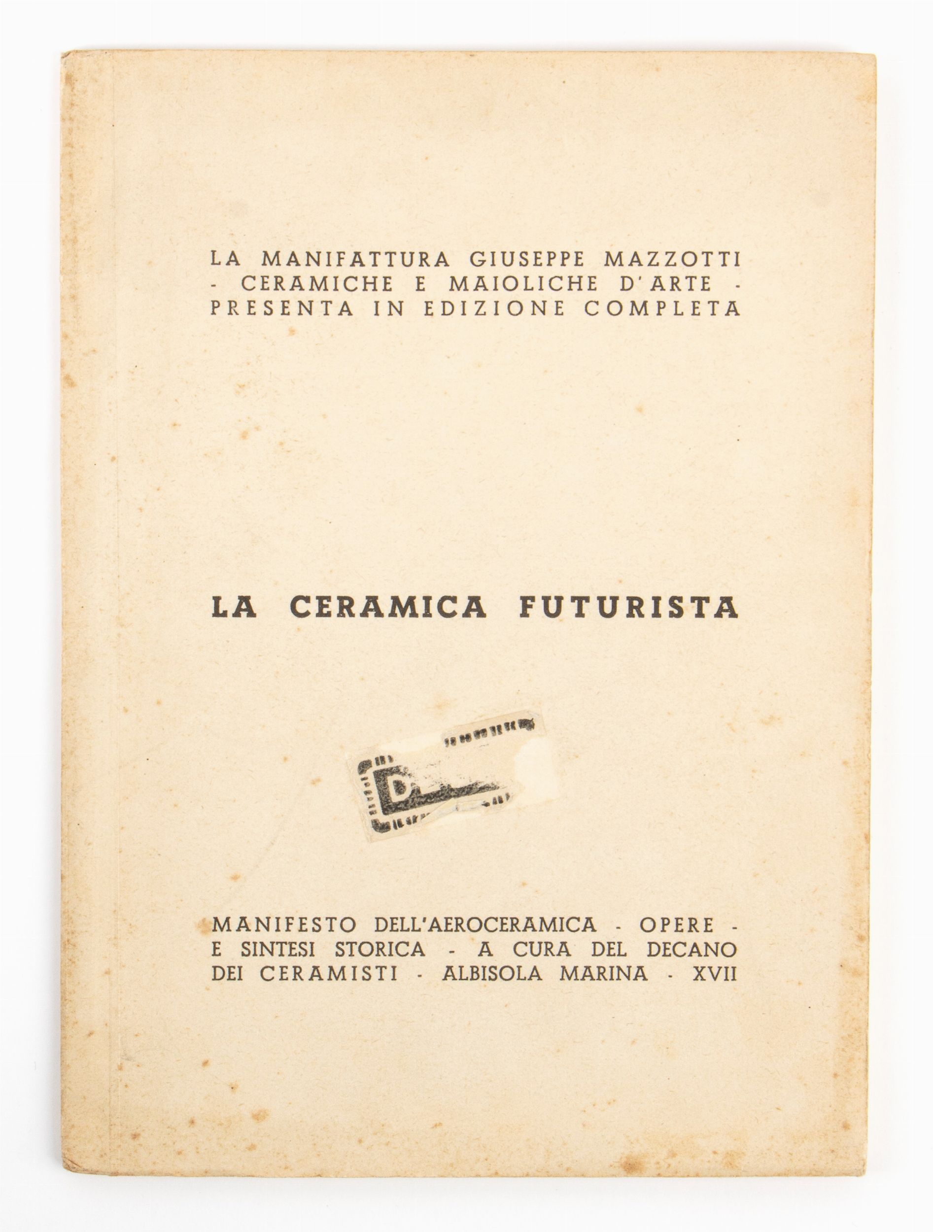 La ceramica futurista. Manifesto dell'aeroceramica - Opere - E sintesi storica - A cura del decano dei ceramisti - Albisola Marina - XVII - Ritratto fotografico di F.T. Marinetti e Giuseppe Mazzotti, 12 riproduzioni di opere in bianco e nero nel testo, testi di T.d'A Tullio d'Albisola. Opere riprodotte dei maestri Mario Anselmo, Tullio D'Albisola, Nicolaj Diulgheroff, Farfa, Fillia, Lucio Fontana, Alfredo “Alf” Gaudenzi, Torido Mazzotti, Bruno Munari, Ricas, Nino Strada. Edizioni Ceramiche Futuriste, stampato nel 1939. Misure cm.12,5 x 17,3. Lievi fioriture sparse in copertina, piccolo ex-libris applicato in copertina, ottime condizioni generali