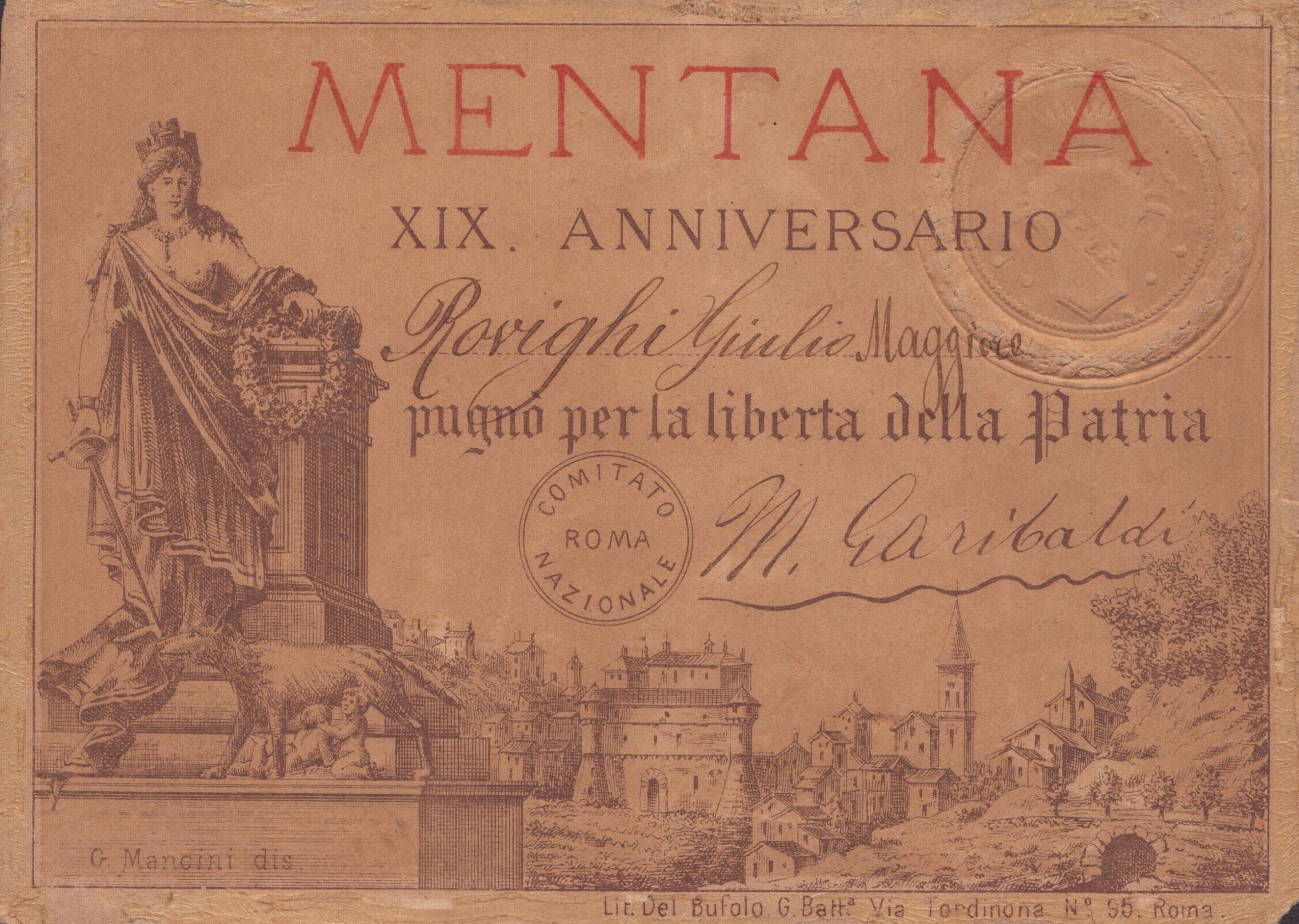 12x16,5cm Cartoncino di attestazione edito nel XIX Anniversario della Battaglia di Mentana per il Maggiore dell'esercito in menzione con la motivazione PUGNO' PER LA LIBERTA' DELLA PATRIA , timbro del Comitato Nazionale, timbro a secco del Comune di Roma SPQR, firmato autografo da Menotti Garibaldi (figlio di Giuseppe Garibaldi). Misure cm.12x16,5 in buone condizioni