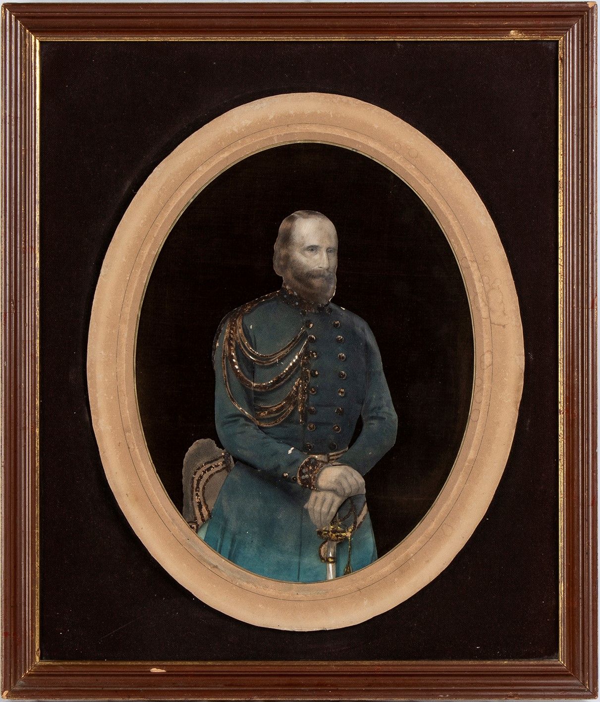 Historical memorabilia... Quadro a composizione ottica, raffigurante Giuseppe Garibaldi in uniforme da Generale Sabaudo, Regno d'Italia. In tunica azzurra, doppia fila di bottoni, cordelle e feluca. Elaborazione su supporto di carta, sagomato e piegato, in maniera da rendere la fruizione del ritratto quasi tridimensionale. In cornice. Interessante cimelio