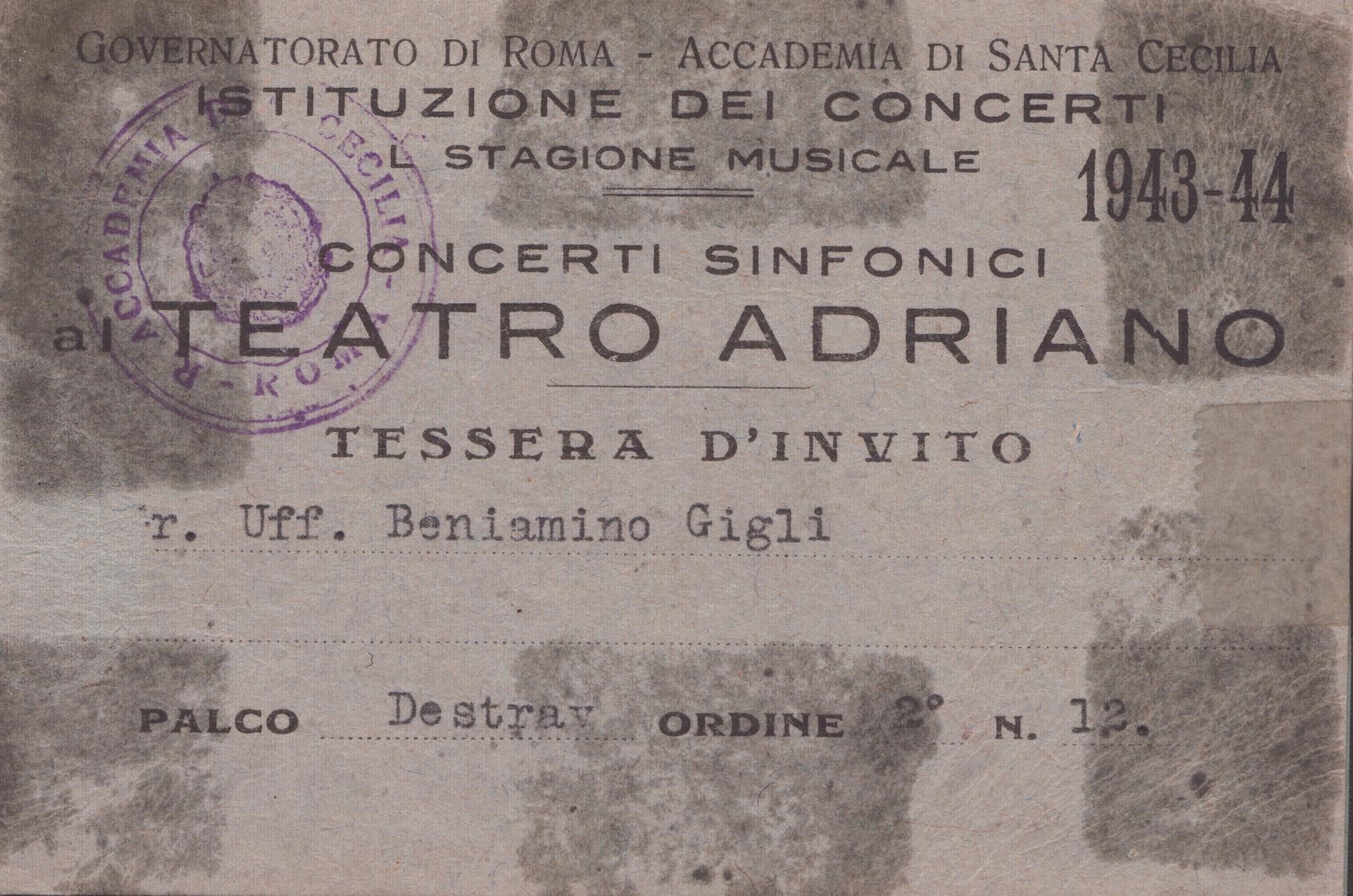 11,5x8cm Tessera del Governatorato di Roma - Accademia degli Studi di Santa Cecilia rilasciata al Gr.Uff. BENIAMINO GIGLI per i CONCERTI SINFONICI AL TEATRO ADRIANO , stagione 1943-44. Cartoncino leggero, stampato, timbro tondo dell'Accademia Santa Cecilia, macchie varie sul fronte, misure circa cm. 8x11,5