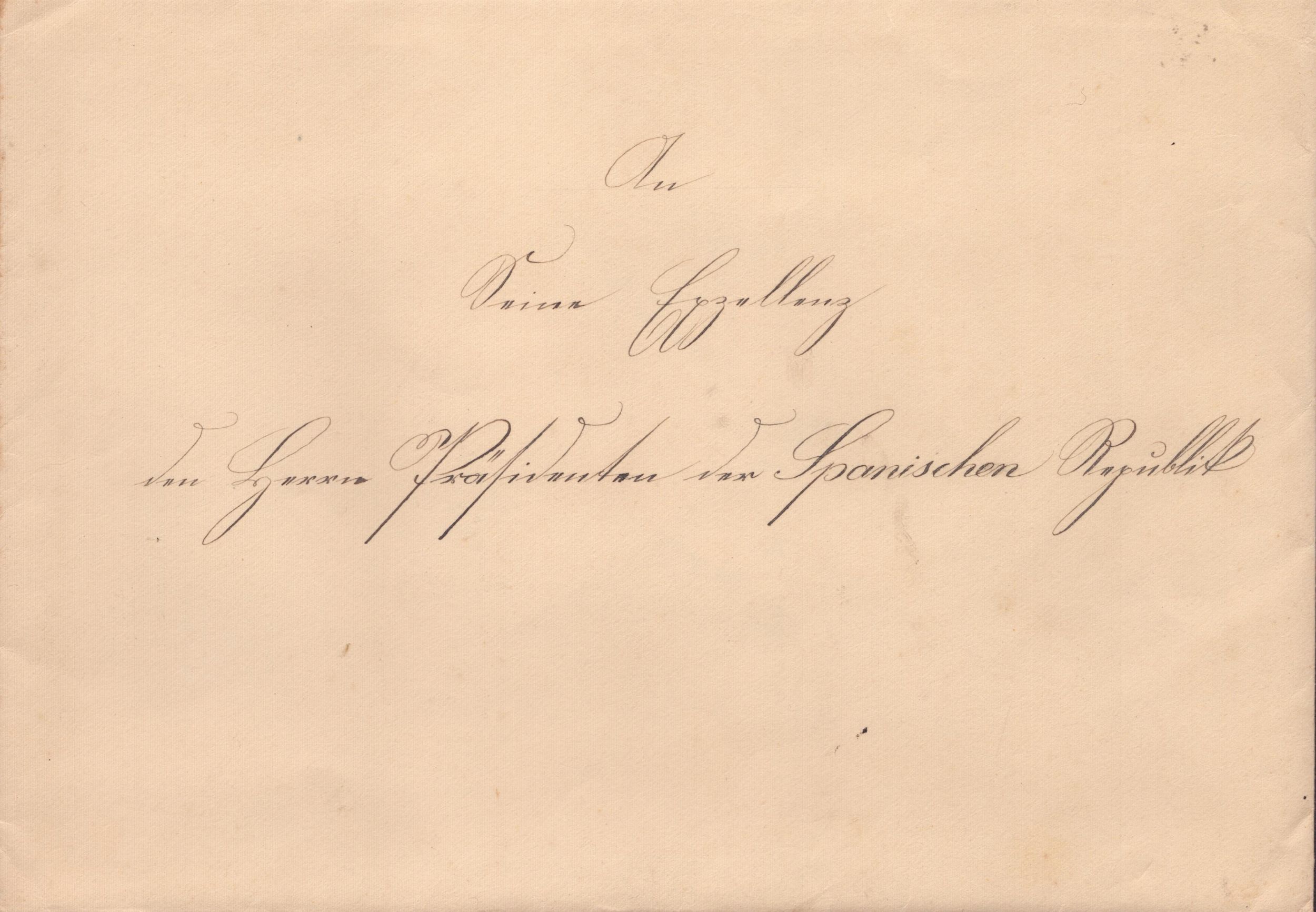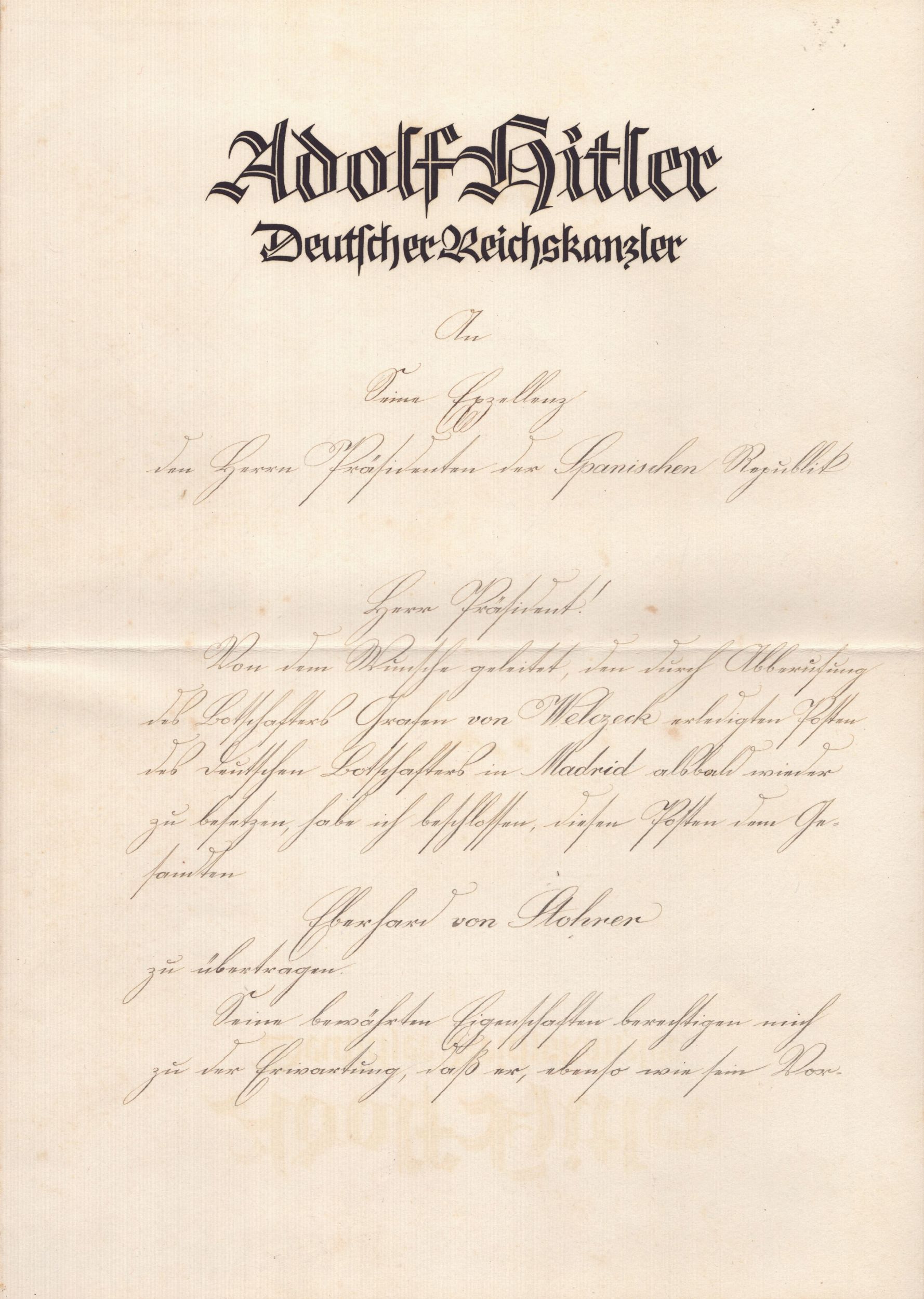 Su carta con intestazione ADOLF HITLER Deutscher Reichskanzler lettera di presentazione del signor Eberhard von Stohrer (5 Febbraio 1883 – 7 Marzo 1953) come Ambasciatore tedesco in Spagna, inviata al Presidente della Repubblica spagnola (Manuel Azaña DÃaz) tramite il diplomatico stesso von Stohrer, incaricato da Hitler di prendere servizio presso l'ambasciata della Repubblica Spagnola durante la Guerra Civile di Spagna negli anni 1936-1939, essendo stato destituito il predecessore Conte von Welczeck. Il testo della lettera/documento continua recitando in sintesi ... <omissis> Le sue comprovate qualità mi autorizzano a ritenere che egli, come il suo predecessore, cercherà di guadagnarsi l'approvazione di Vostra Eccellenza nell'onorevole incarico affidatogli. Il signor von Stohrer avrà l'onore di presentarLe, signor Presidente, la presente lettera, che ha lo scopo di autenticarlo in qualità di Ambasciatore straordinario e plenipotenziario del Reich tedesco. Prego che sia ricevuto con favore e che gli sia dato pieno credito in tutto ciò che sarà chiamato a dire a mio nome o a nome del Governo del Reich tedesco. <omissi> Berchtesgaden, 16 Luglio 1936 - La lettera è firmata autografa, originale, in inchiostro nero da Adolf Hitler , e controfirmata in basso a destra dal segretario ........... - Lettera di un foglio, 4 pagine, le prime due compilate a mano, contenuta nella busta originale con l'intestazione An Seine Exzellenz den Herrn Prasidenten der Spanischen Republik chiusa da sigillo cartaceo originale in rilievo del Reich tedesco. - Misure di una facciata della lettera cm.21x29,7 Misure della busta cm.16x22,7. Lettera in eccellenti condizioni, con piega centrale per permetterne l'inserimento in busta.
