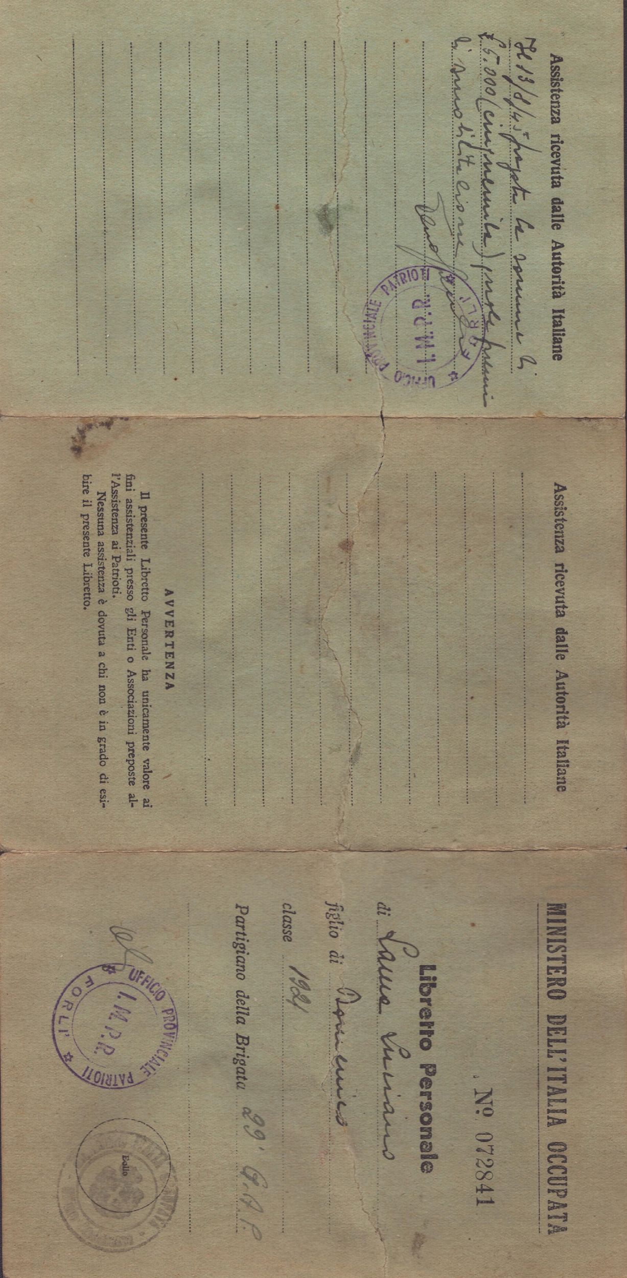 16x11cm Libretto personale di Luciano Lama, rilasciato dal MINISTERO DELL'ITALIA OCCUPATA, dall'Ufficio Provinciale Patrioti di Forlì, per il PARTIGIANO DELLA BRIGATA 29° G.A.P. - Libretto in cartoncino verdino, a tre sezioni, con i dati di ATTIVITA' CLANDESTINA SVOLTA DAL TITOLARE , graduato come CAPO DI STATO MAGGIORE della brigata di appartenenza. Strappo centrale, restaurata. Condizioni mediocri. Misure di ogni sezione cm. 11x16