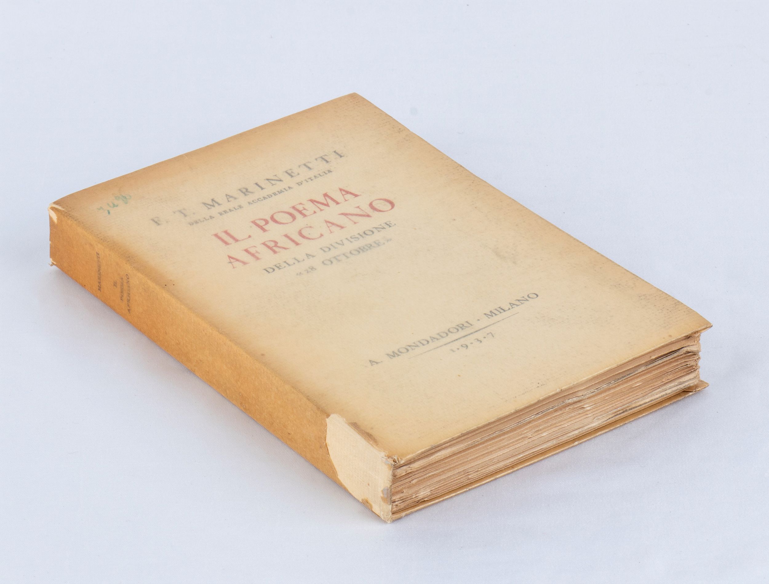 Dedica e firma autografe di Filippo Tommaso Marinetti sul volume Il poema africano, scritti ad inchiostro nero, indirizzata al Vico Pellizzari senatore del Regno.